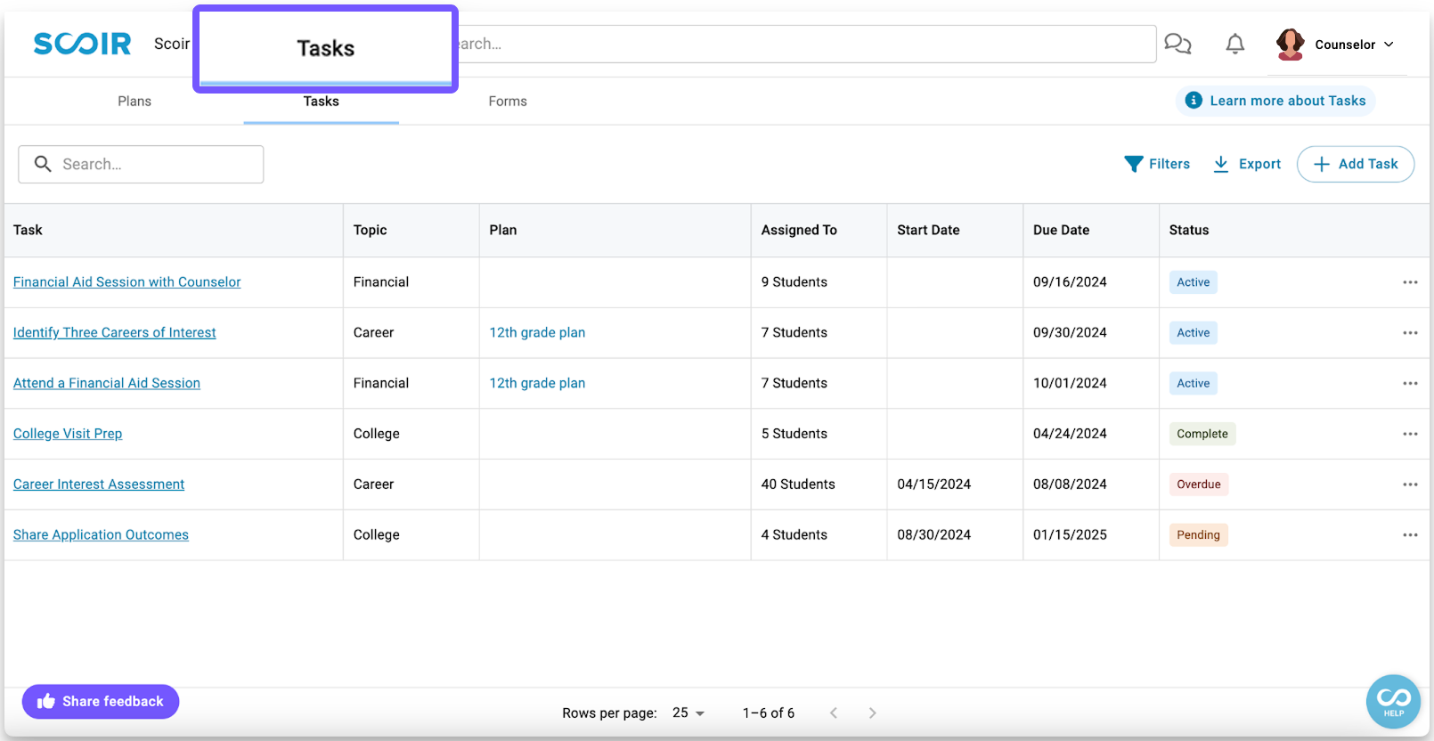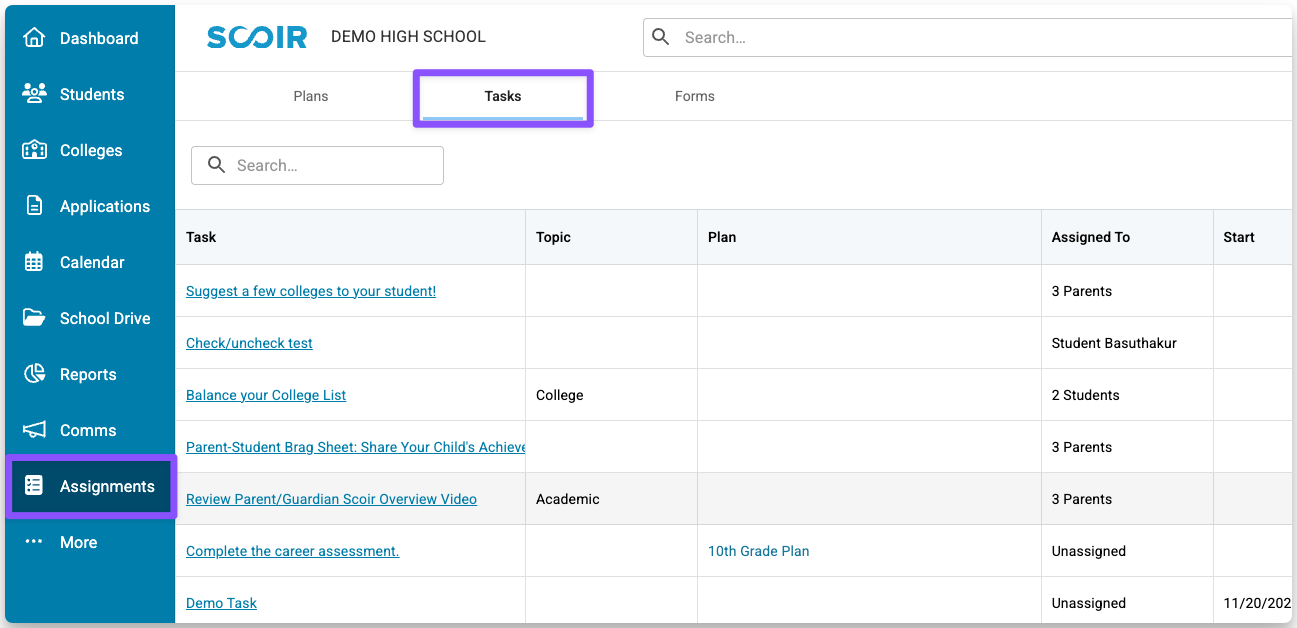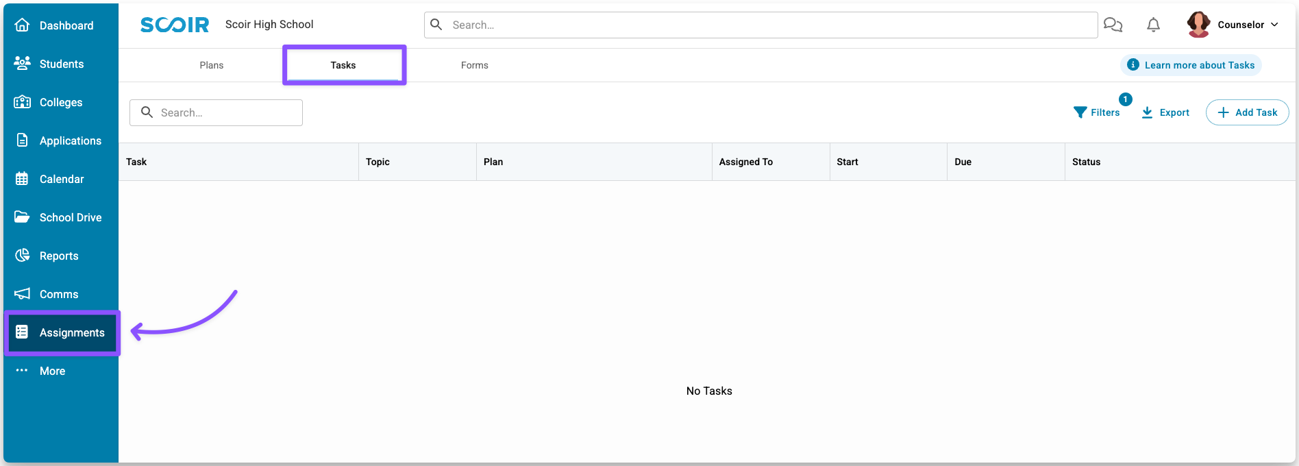 Tasks are part of Assignments, a suite of tools in Scoir that helps counselors guide students through college and career readiness. With Tasks, you can share resources, assign activities, and track progress all in one place. You can also assign Tasks to parents and guardians to help them stay connected and support their students along the way.