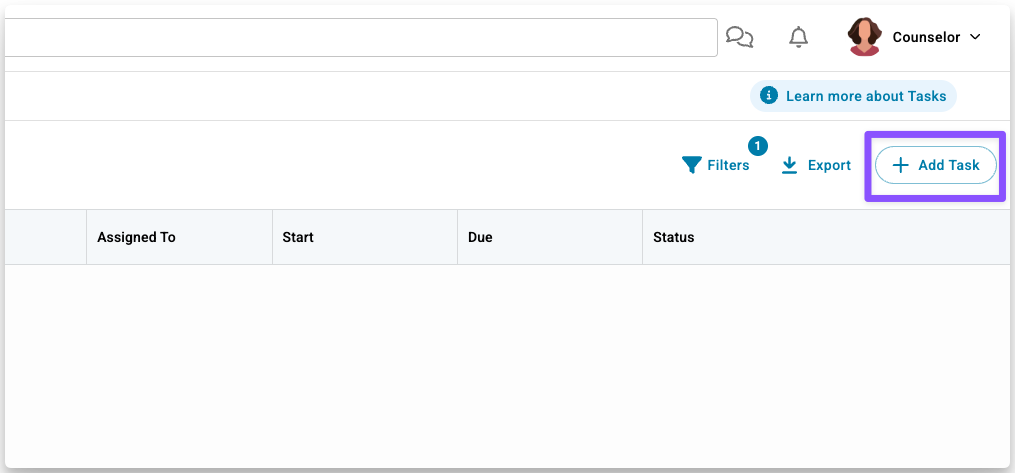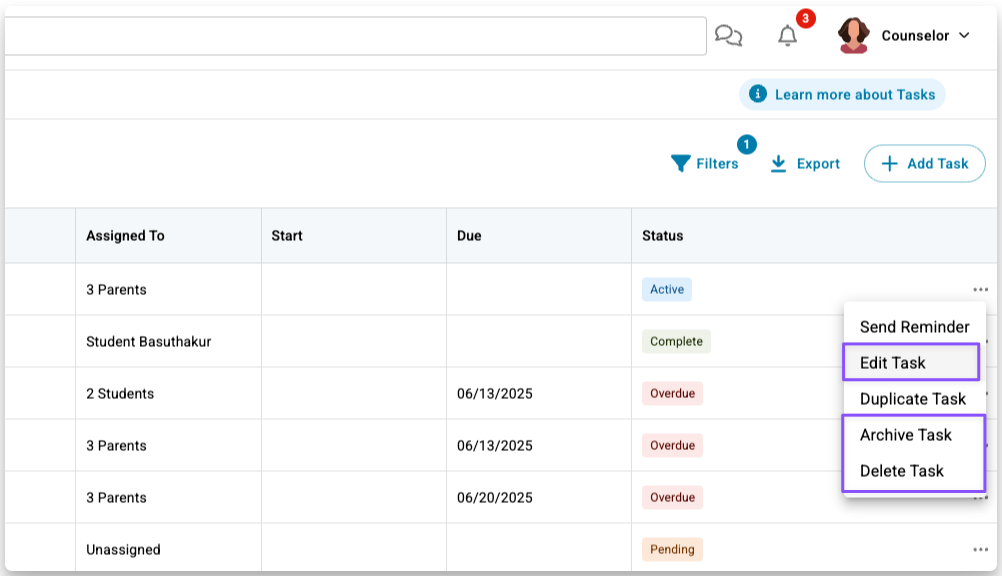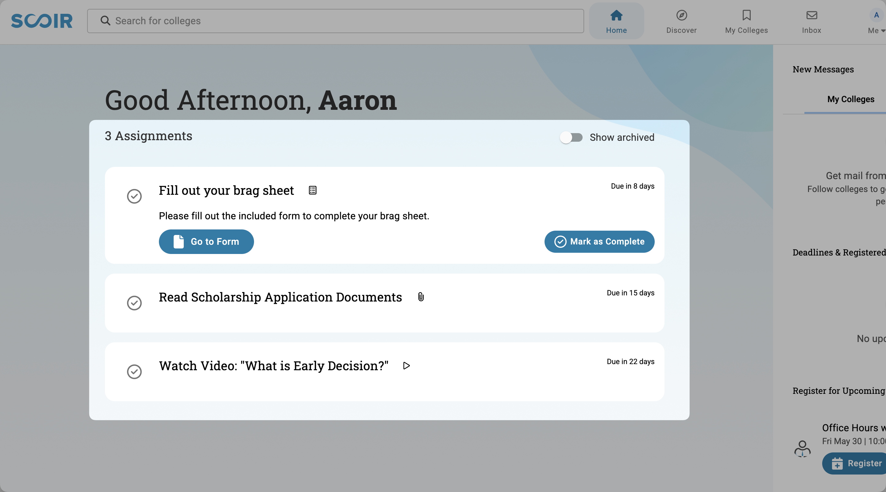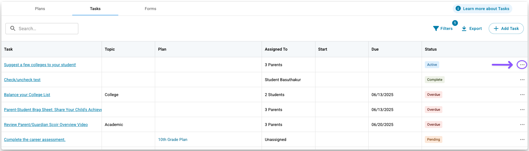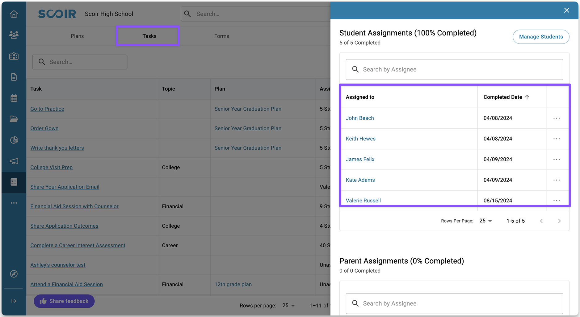 Tasks are part of Assignments, a suite of tools in Scoir that helps counselors guide students through college and career readiness. With Tasks, you can share resources, assign activities, and track progress all in one place. You can also assign Tasks to parents and guardians to help them stay connected and support their students along the way.
