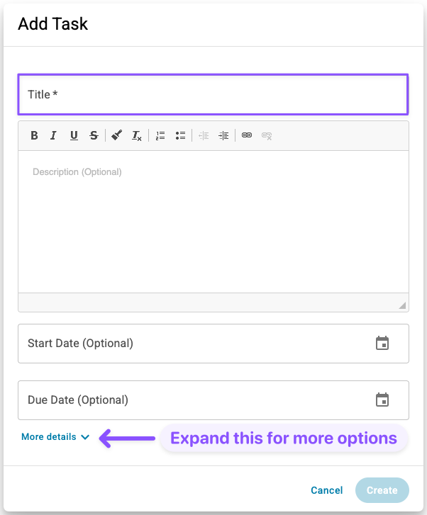 - Click Create. Your new task will now appear in the Tasks table—ready for you to review, edit, or assign when you’re ready.