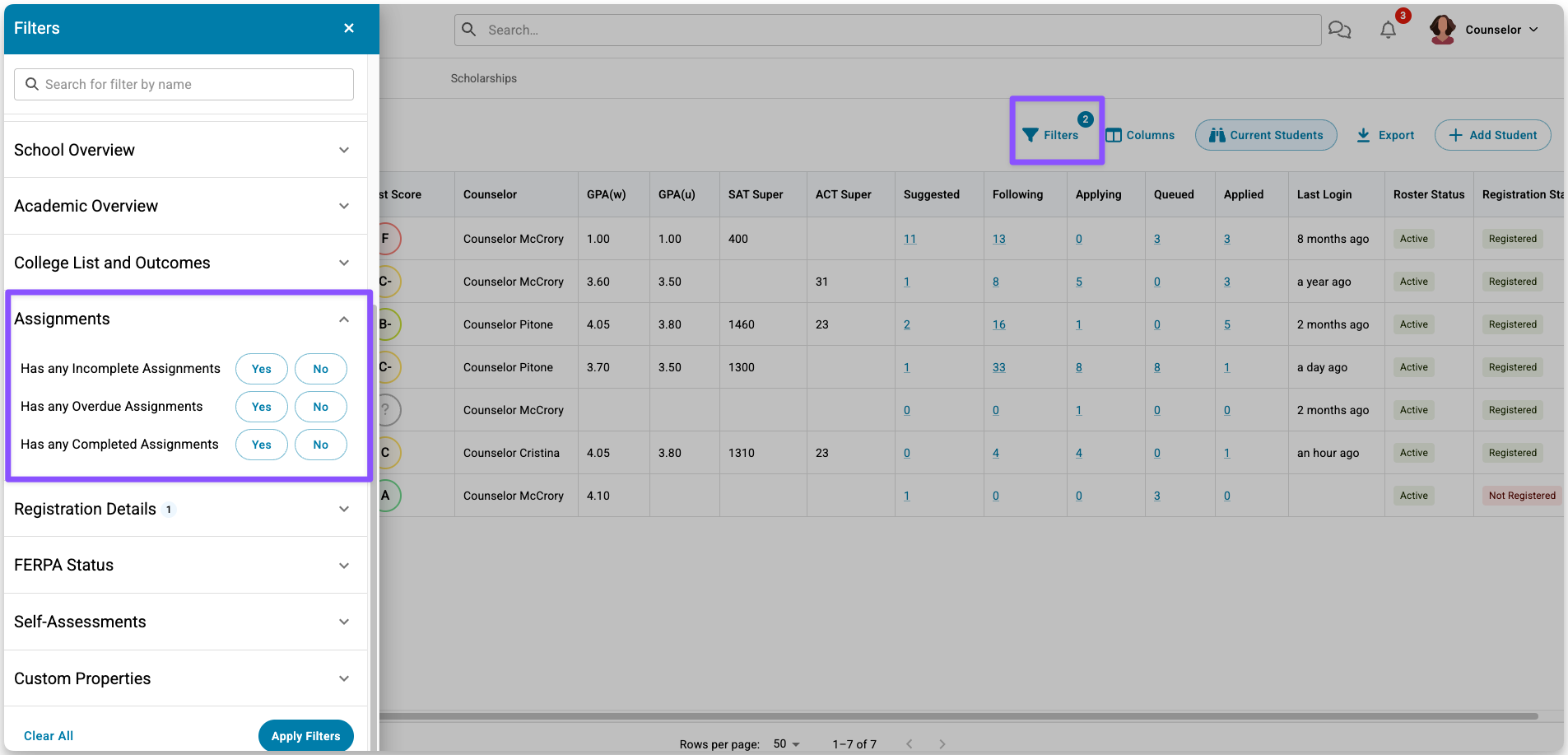 In the Student Roster, you can add columns to see how many Assignments each student has that are incomplete, overdue, or completed. You can filter by those statuses as well. From there, you can click into any student's profile to see their specific Assignments.