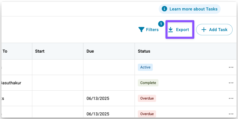 - Apply any filters—such as by topic, date range, or completion status—to narrow down which tasks will be included.Filtering before exporting helps you create focused reports—for example, only tasks that are overdue or only those related to a specific topic.