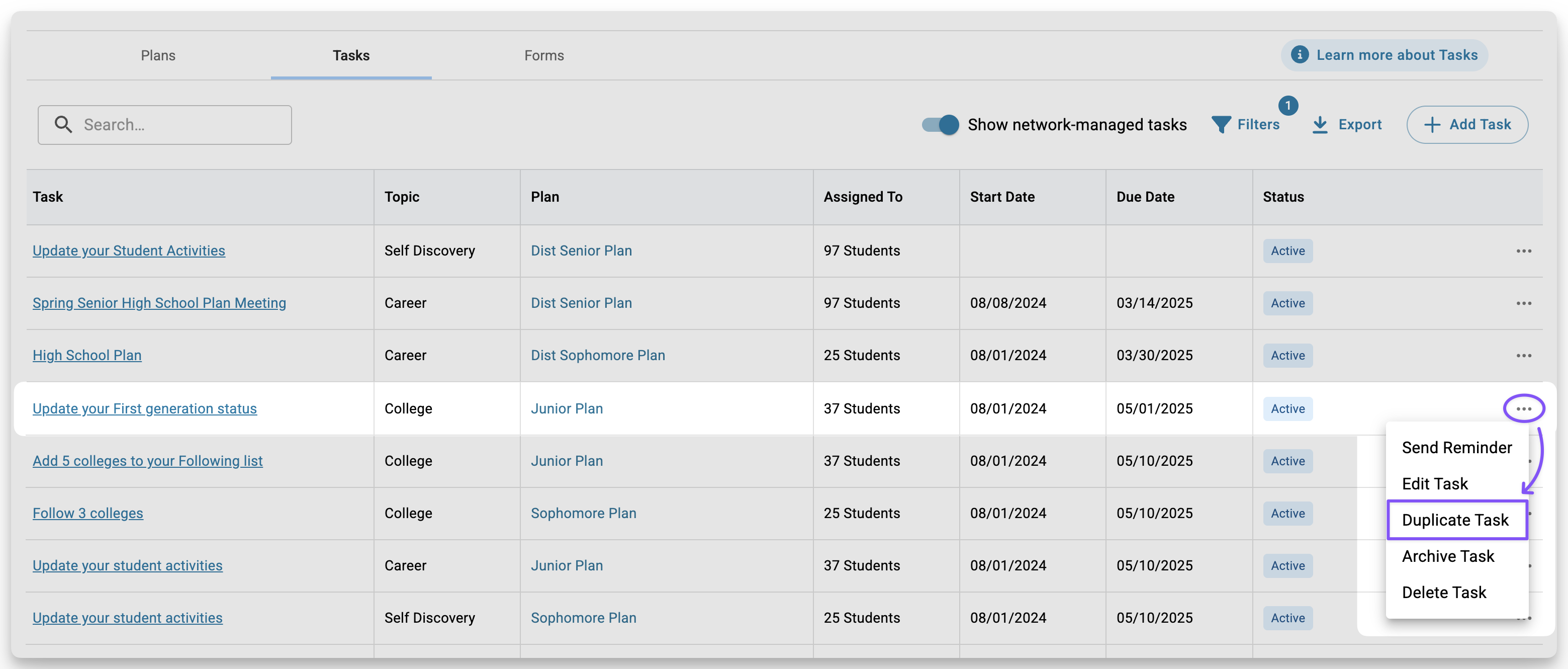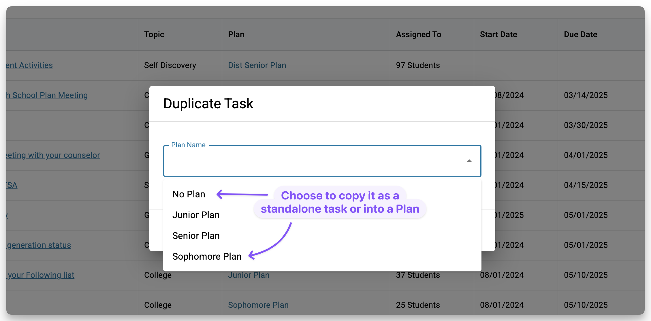 Tasks duplicated into an active Plan are automatically assigned to the students in that Plan. Tasks duplicated into a draft Plan won’t be assigned until the Plan is published.