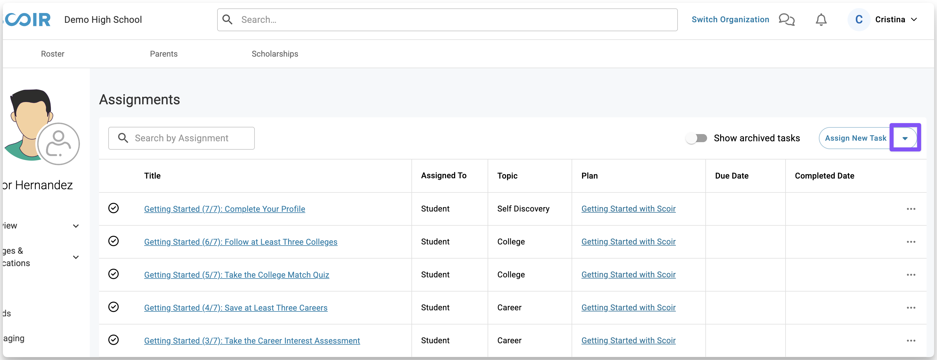 A Task is a specific action you ask someone to complete: reviewing a document, watching a video, filling out a form, or taking a step in Scoir like adding colleges to their list. With Tasks, you can share resources, collect information, and track progress.