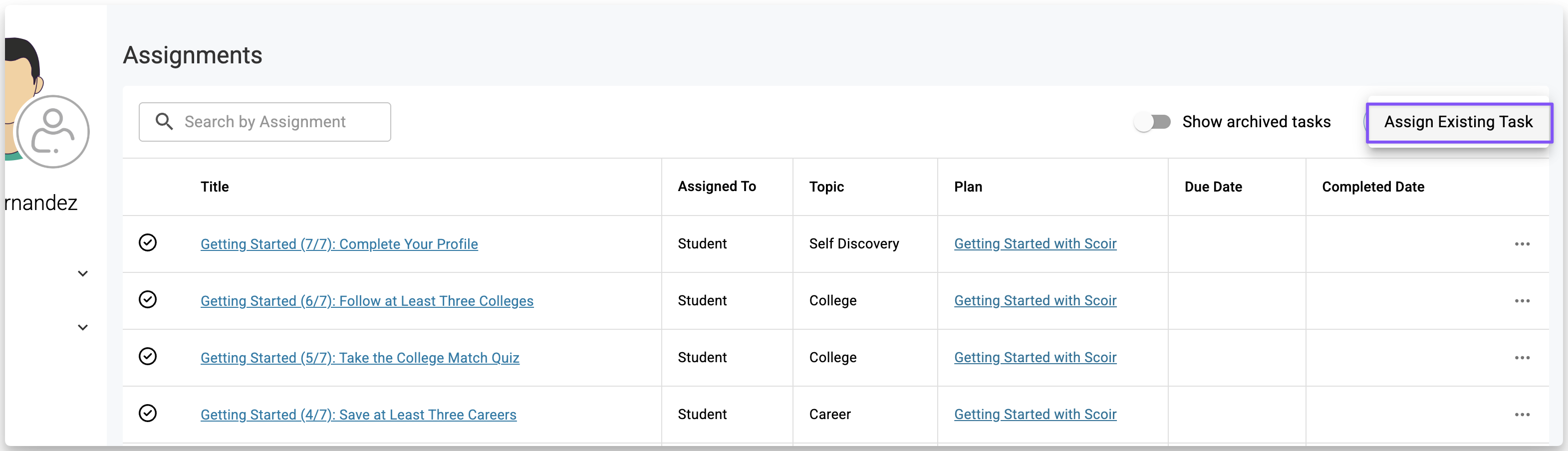 - Once archived, tasks do not appear on the Tasks page's default view or in the student profile's Assignments section. Use the Archived filter or turn on the Show archived tasks toggle to view them. Archived tasks are also not shown in the student preview on the student roster.