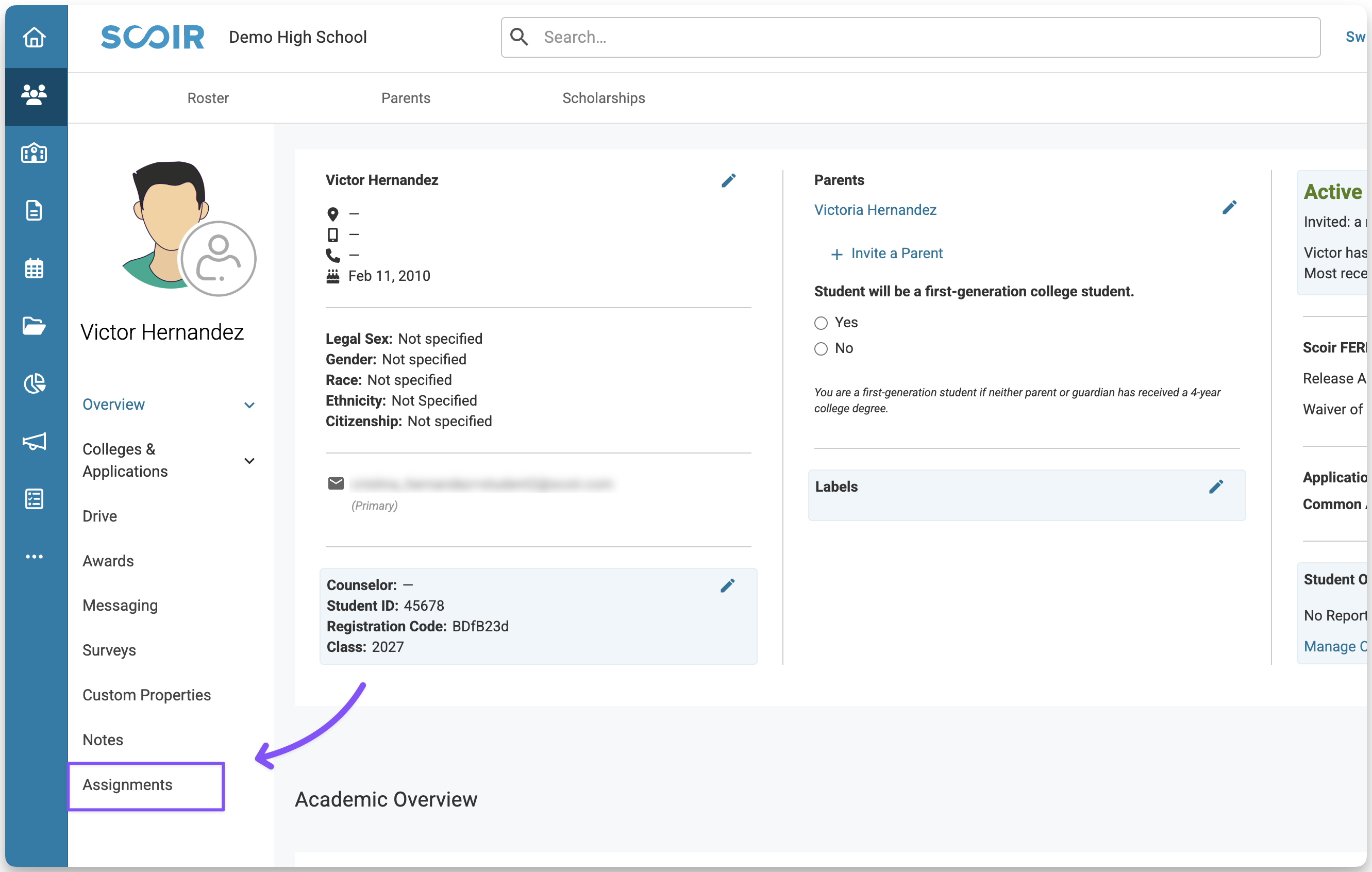 - Go to the student’s profile, then click Assignments in the left-hand menu.