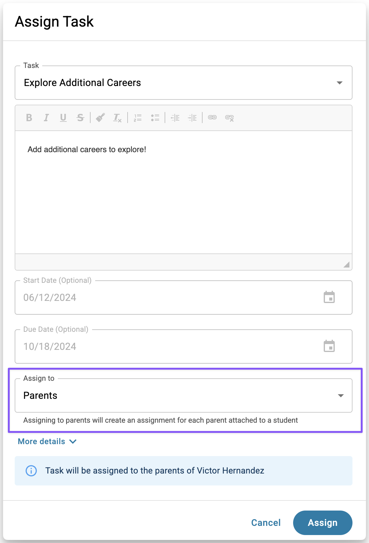 - Click Assign to finish. The parent will receive their own copy of the Task. If the student has multiple parents in Scoir, each parent will receive the Task.