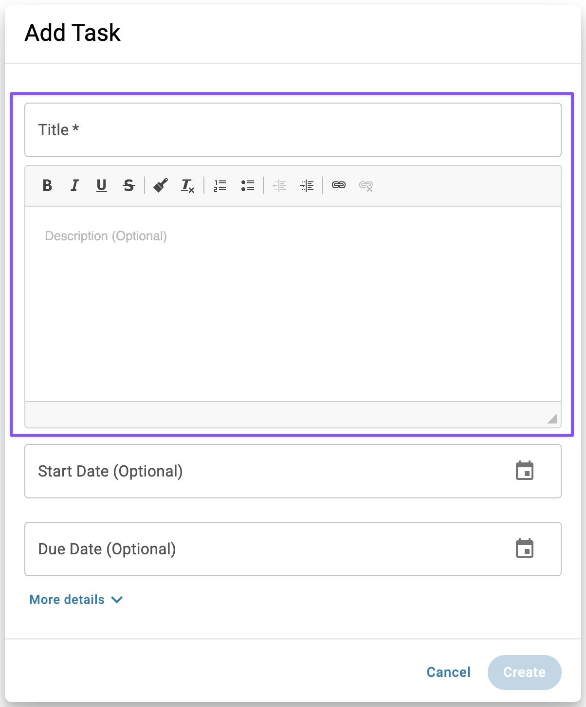 - Click Create. Your Task will appear in the Tasks table, where you can review, edit, or assign it when you're ready.