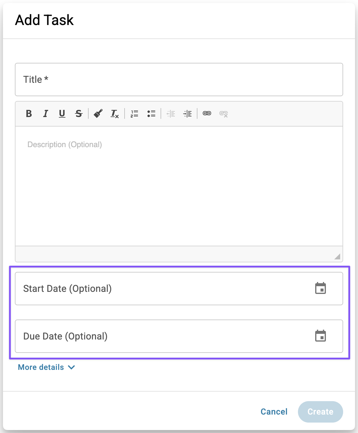 - Set a start date and due date (optional). The start date is when the Task appears on students' dashboards. The due date is when it should be completed. If the due date passes, the Task will be marked overdue, but students can still complete it.