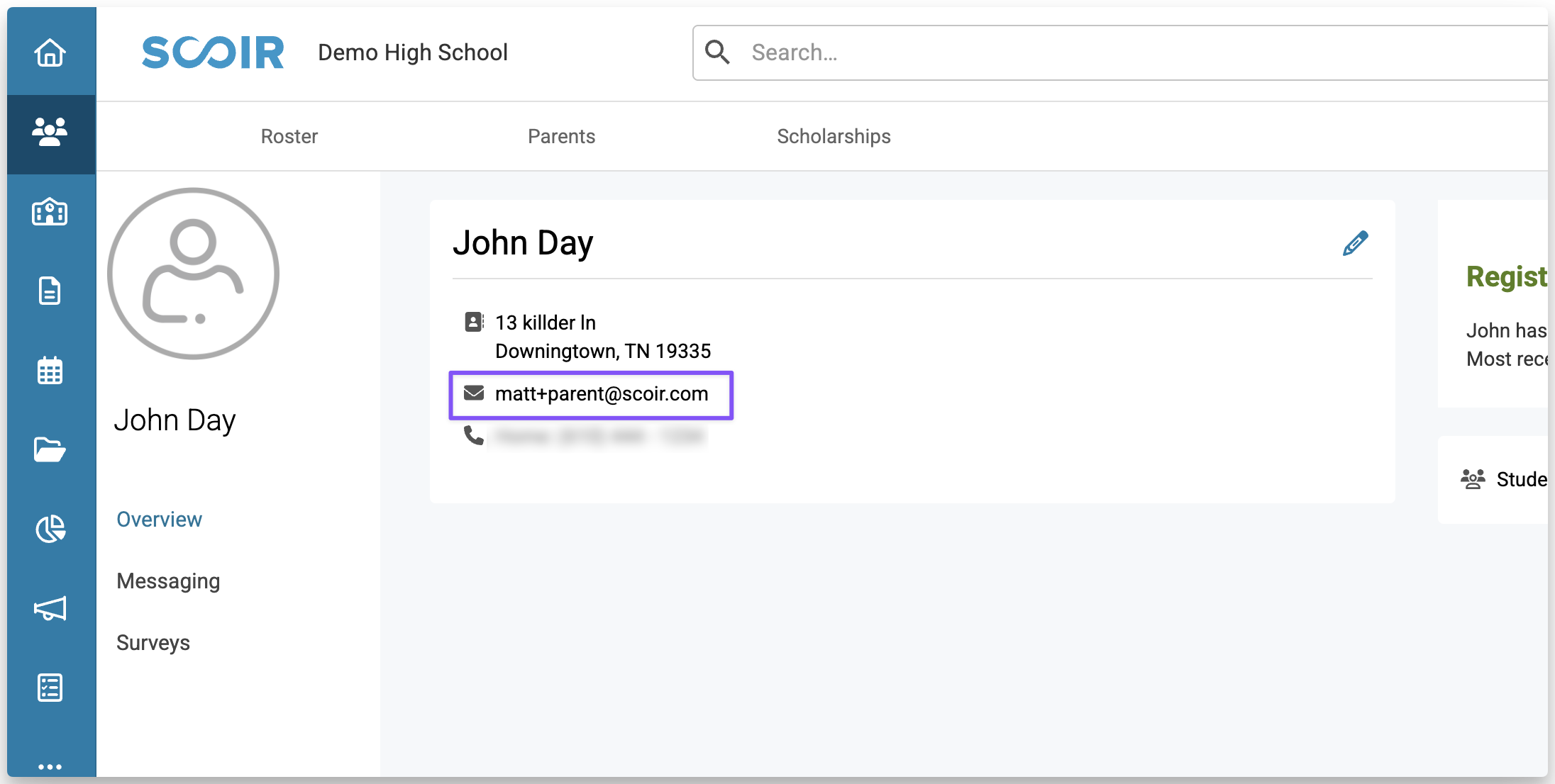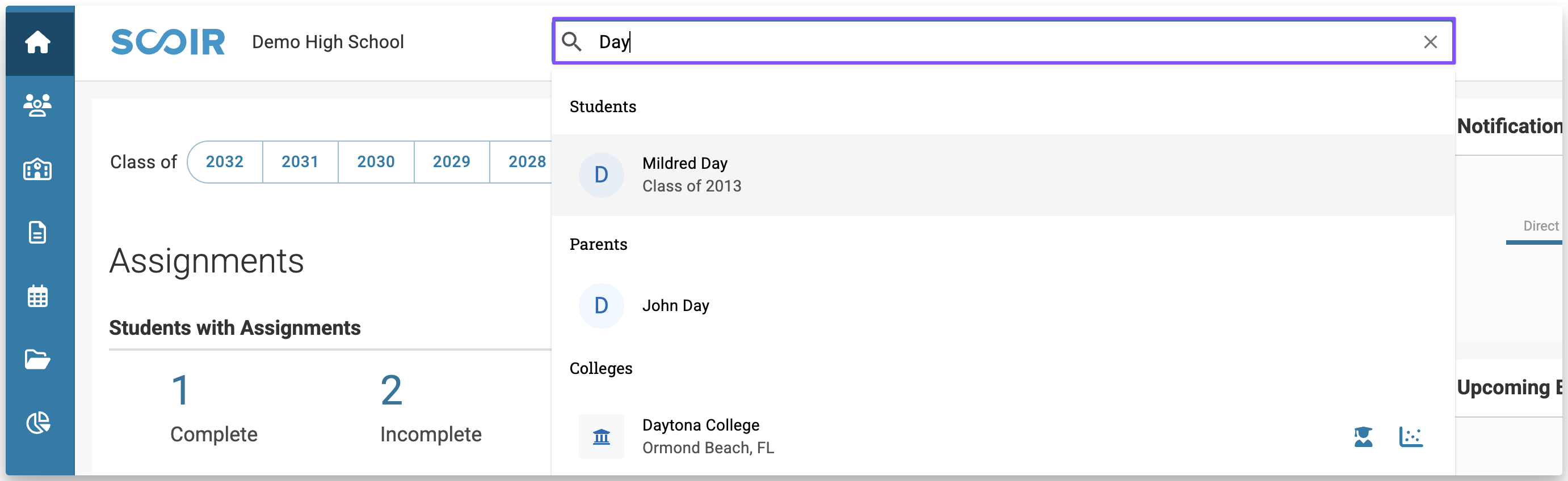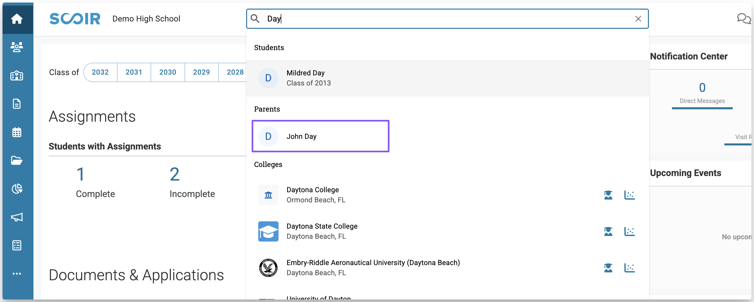 - Use the main search bar at the top of Scoir to search for the parent by name. If you don’t see them right away, try searching by last name only.