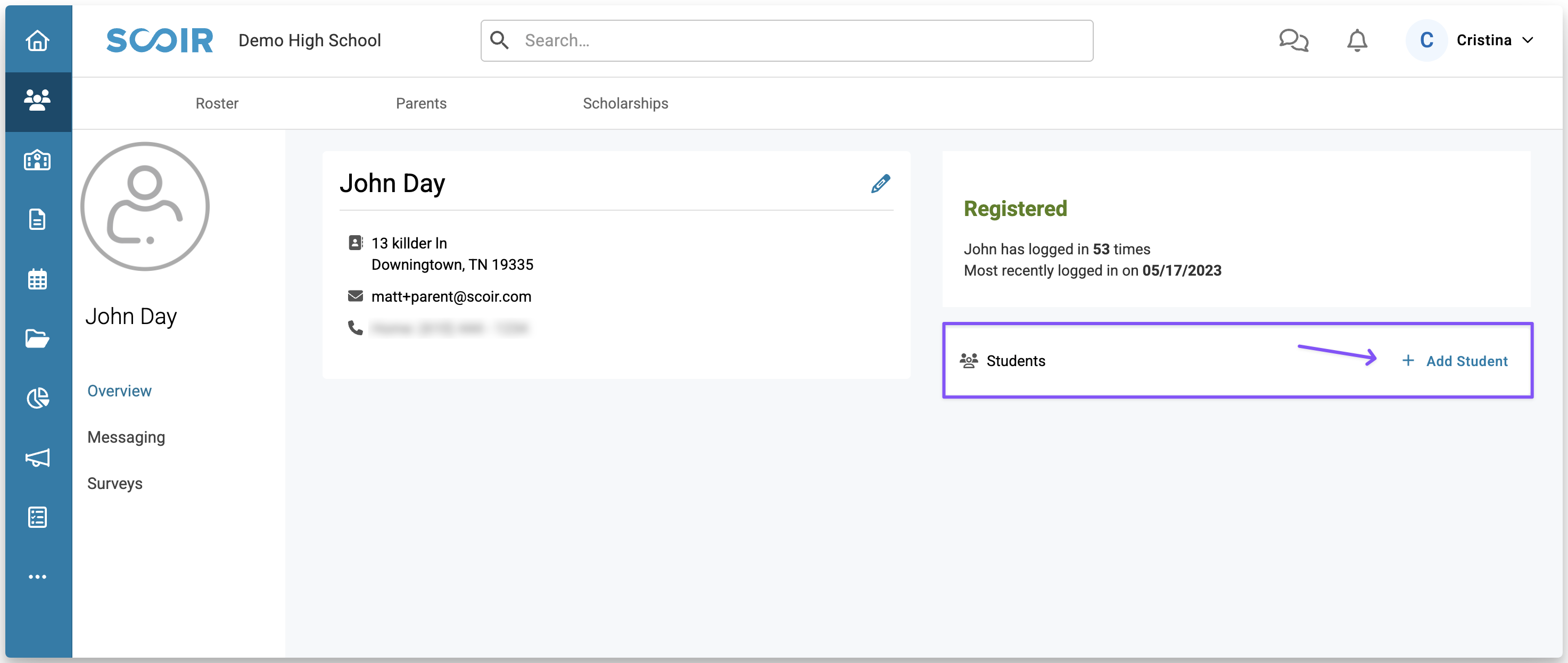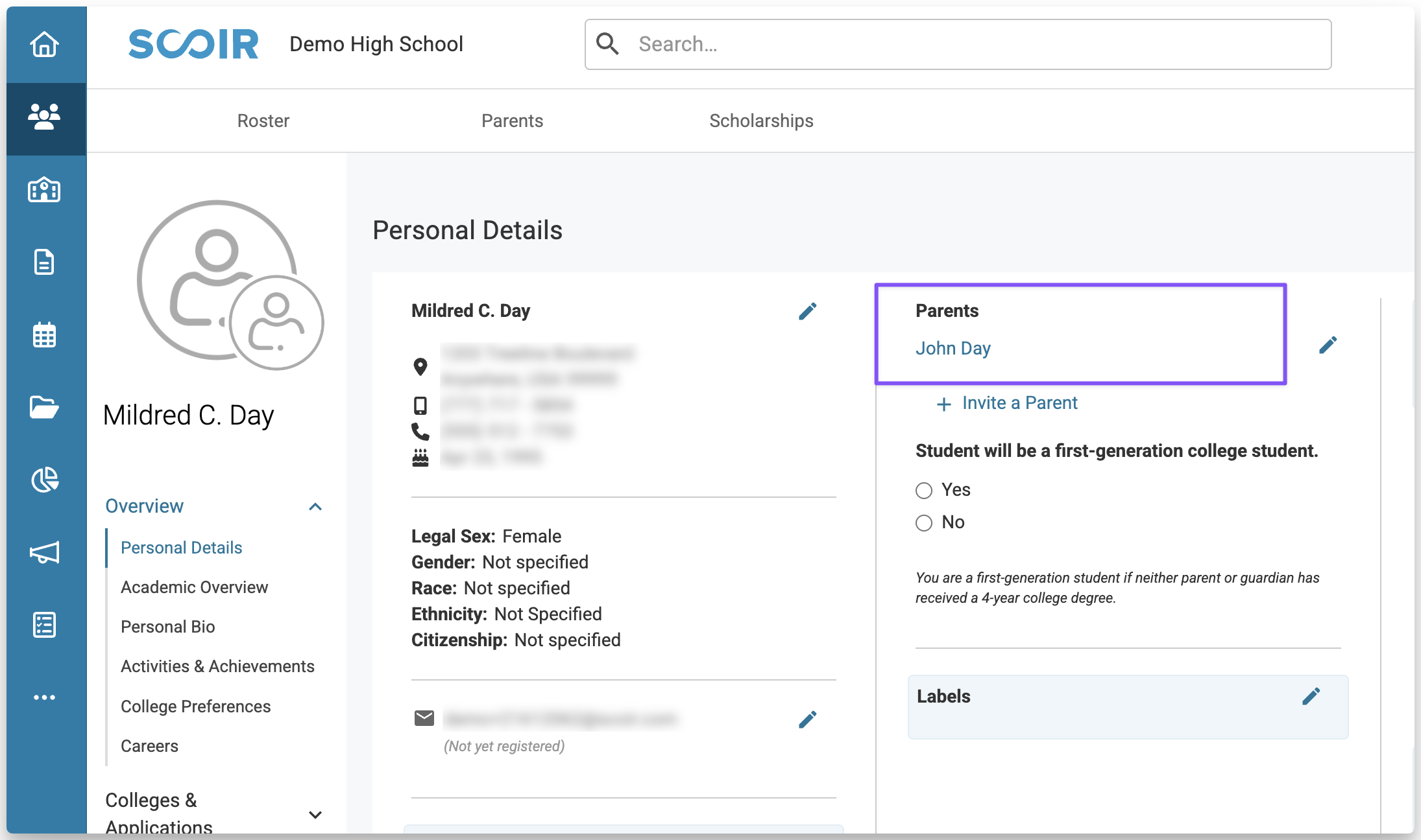 - To confirm the parent has been connected, go to the student’s profile and check that their name appears in the Parents section.