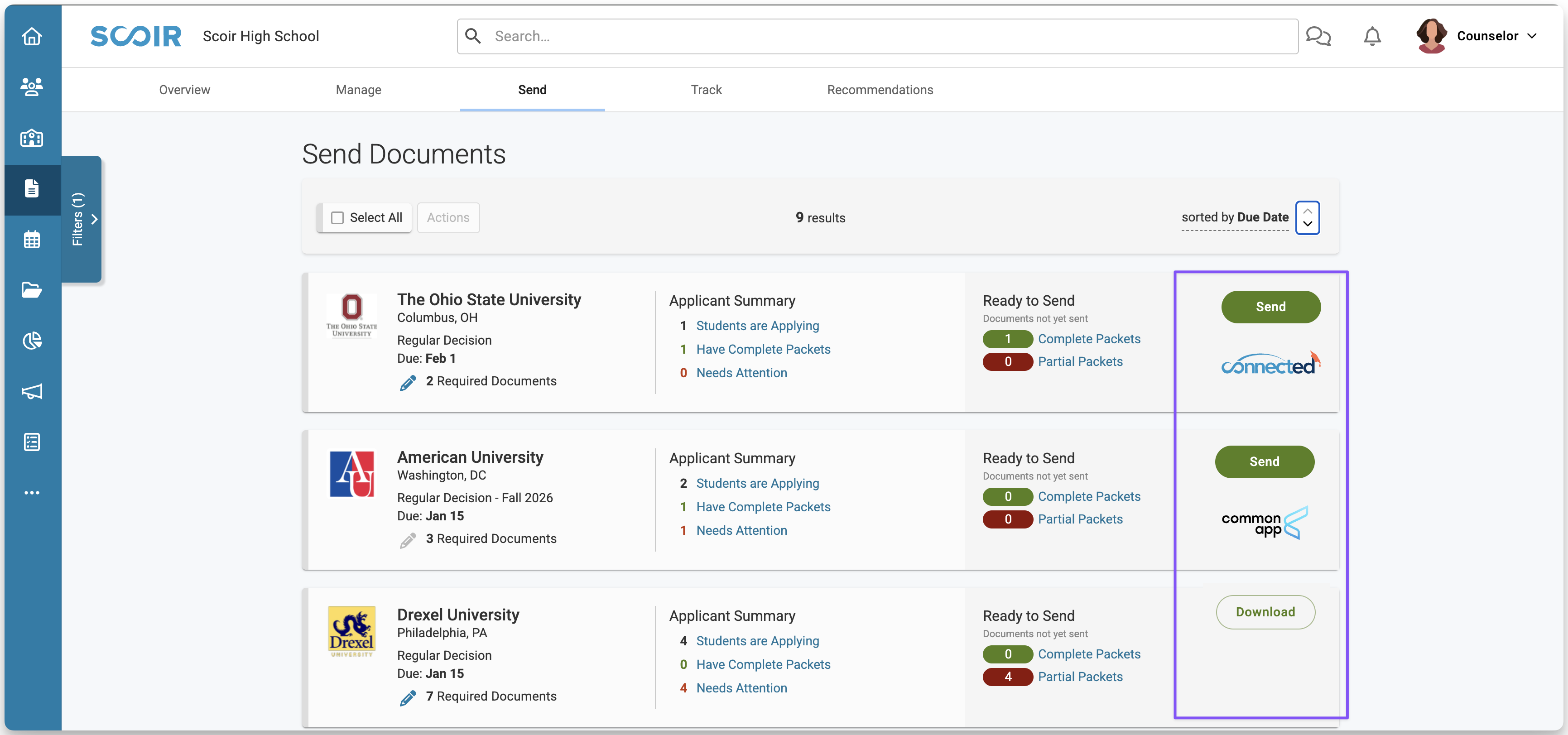 You can work your way through each college individually on this page, or send documents to multiple colleges at once. To do so, either select multiple college tiles and choose Actions > Send, or click Select All and then Actions > Send to send many packets at once. You may want to apply a filter first—for example, to show only Completed Packets—but it's not required.