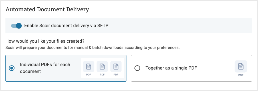 Once you’ve successfully set up a connection and selected a configuration, you can begin using your SFTP connection to automate document delivery by setting the Enable Scoir document delivery via SFTP toggle to Active.