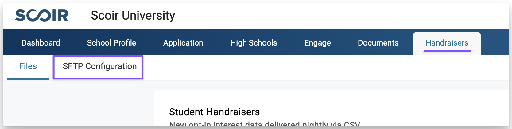 Scoir supports automated file delivery via SFTP for both application documents and Handraiser data, a daily list of prospective students who have opted in to share their information with your institution. This guide walks through how to set up a manual SFTP connection.