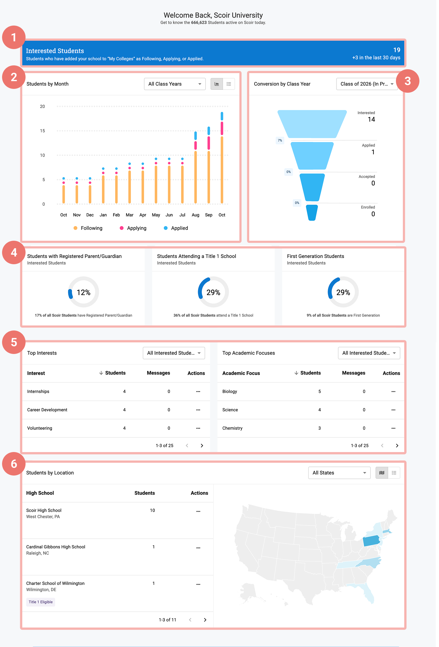 The Scoir Admissions Insights Dashboard provides a clear view of the students on Scoir who have shown interest in your college and those your outreach efforts have reached.