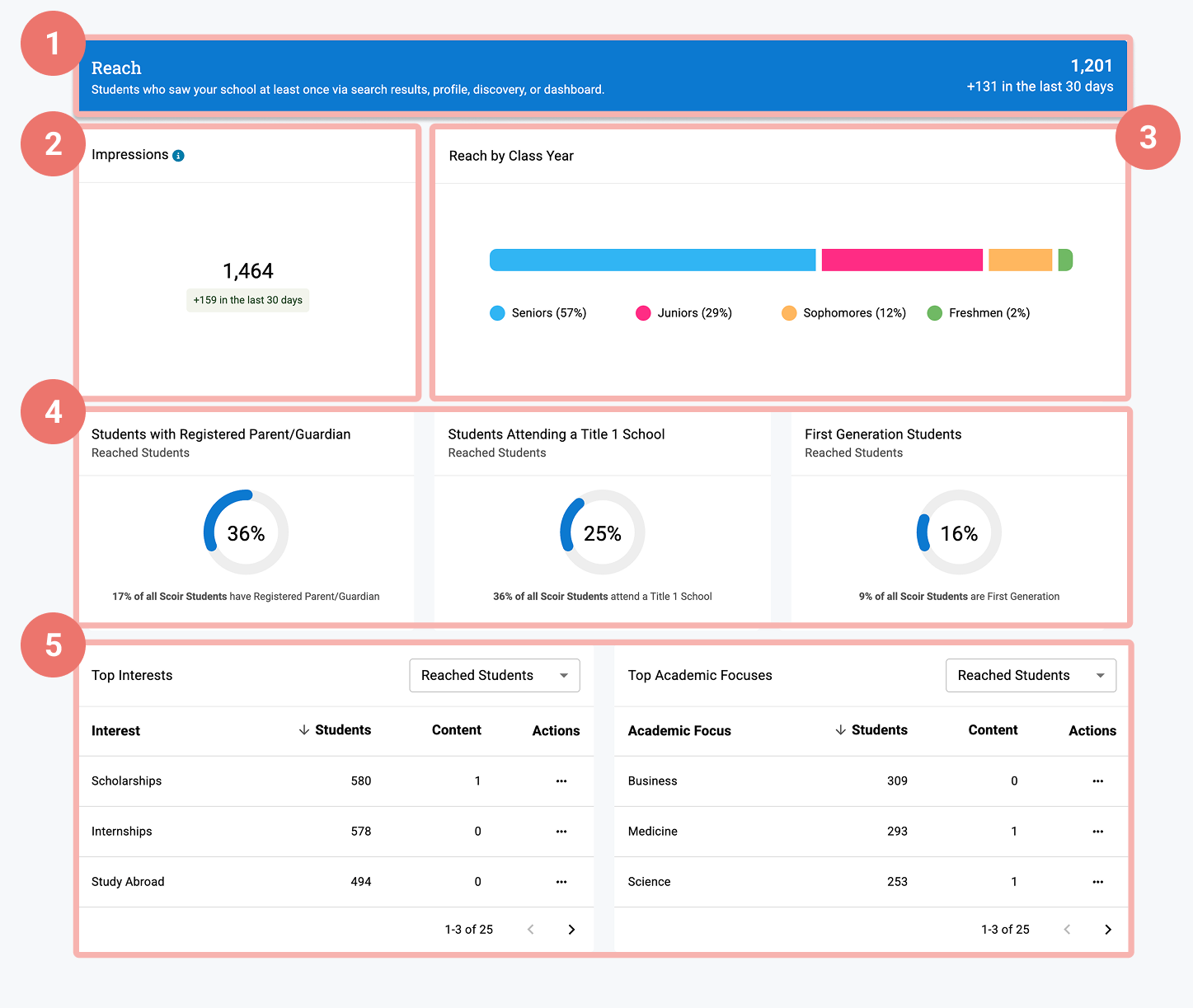 - The Reach banner displays the total number of students who saw your school at least once via search results, profile, discovery, or dashboard, including the number of unique students your brand has reached in the last thirty days.