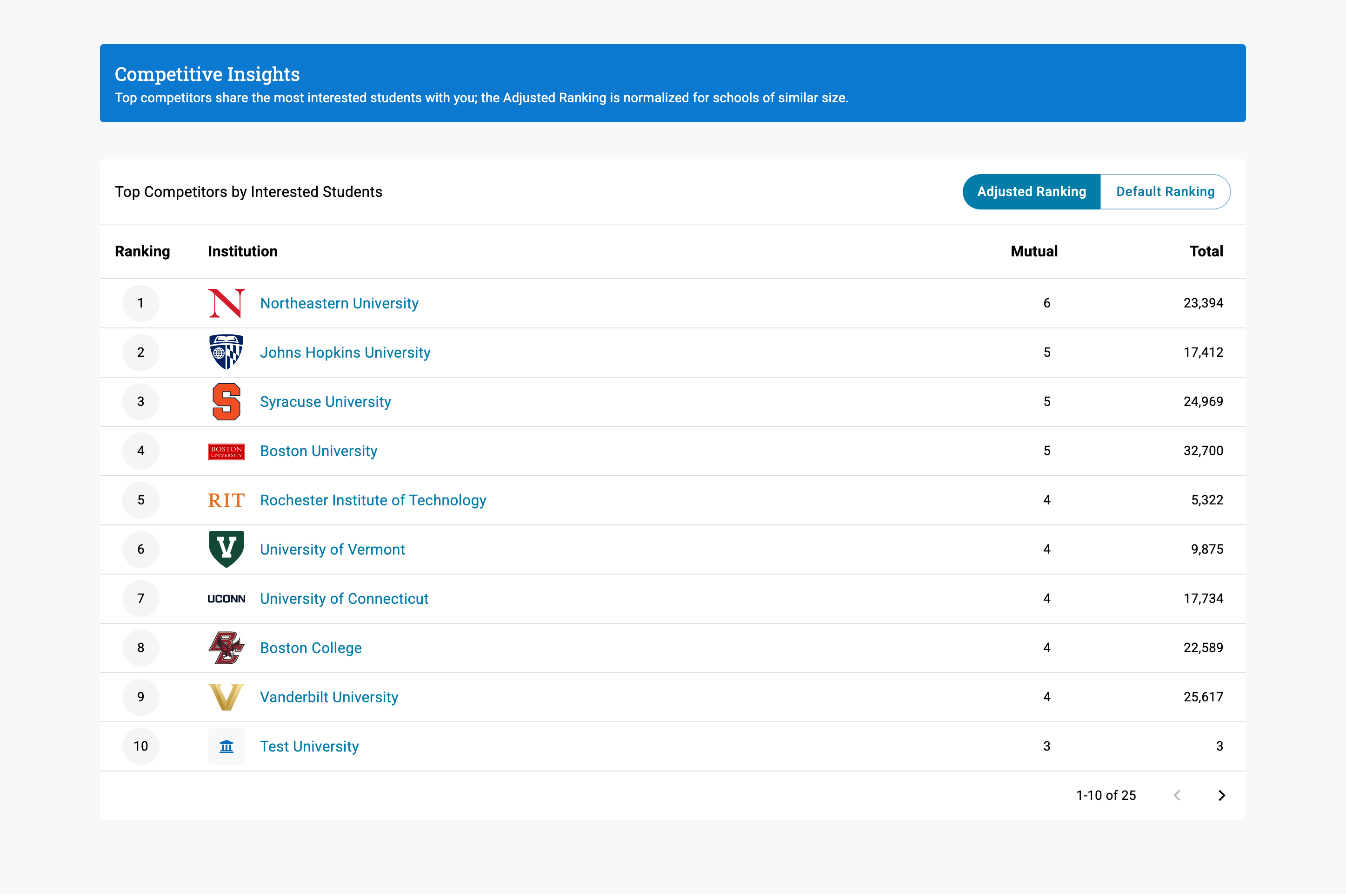 The Competitive Insights section highlights the colleges that share the most interested students with your institution. The Adjusted Ranking normalizes results for schools of similar size, while the Default Ranking shows overall totals.