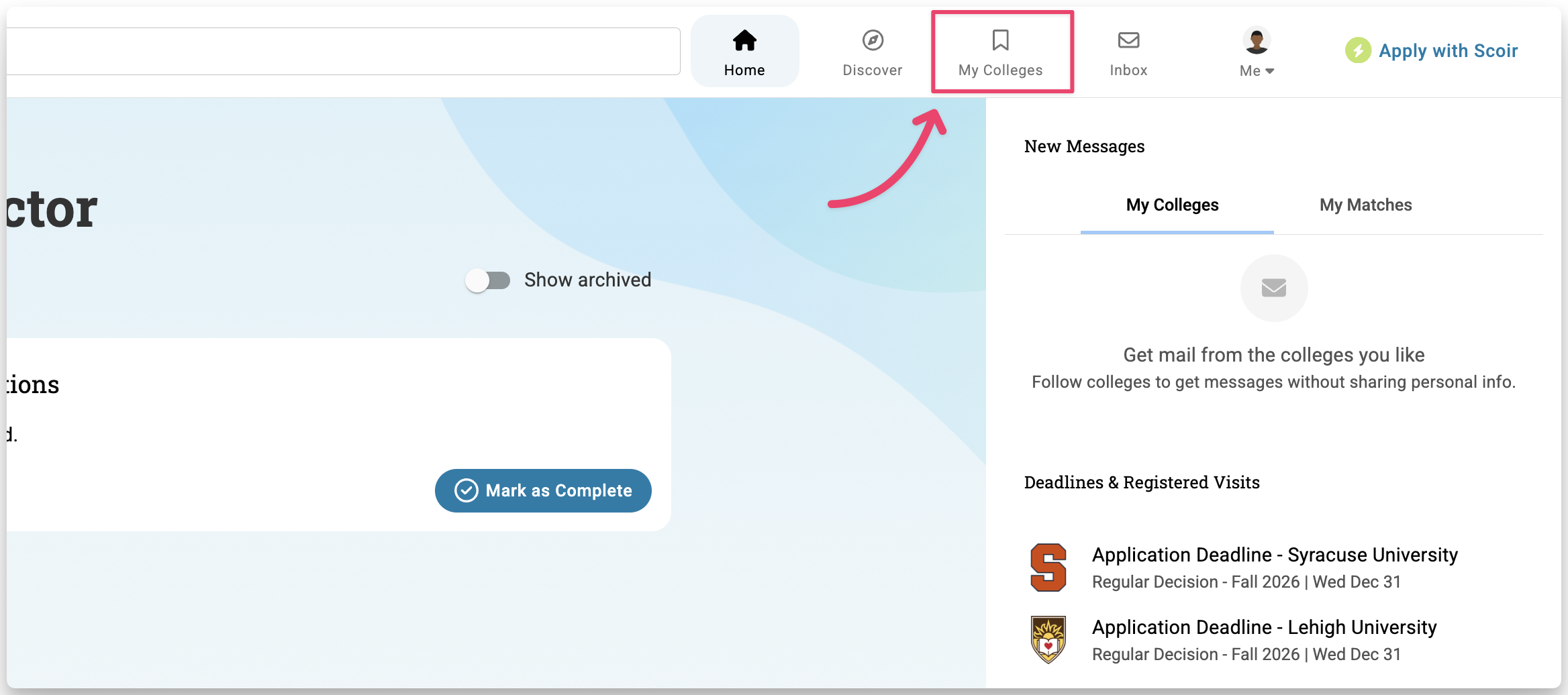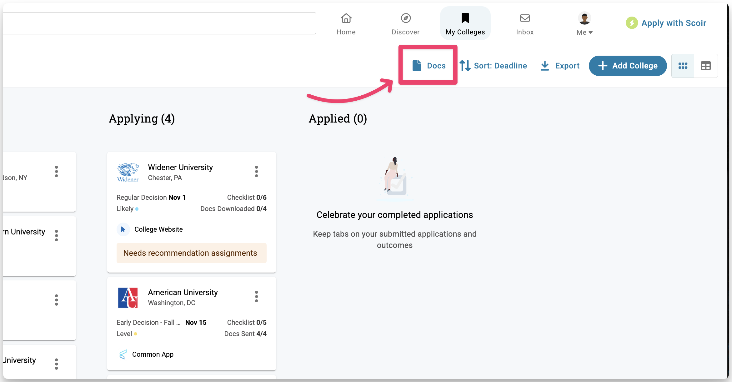 In the top-right corner, click Docs to access your application documents. This option only appears if your account is connected to a high school that uses Scoir and has enabled the ability to send documents on your behalf.
