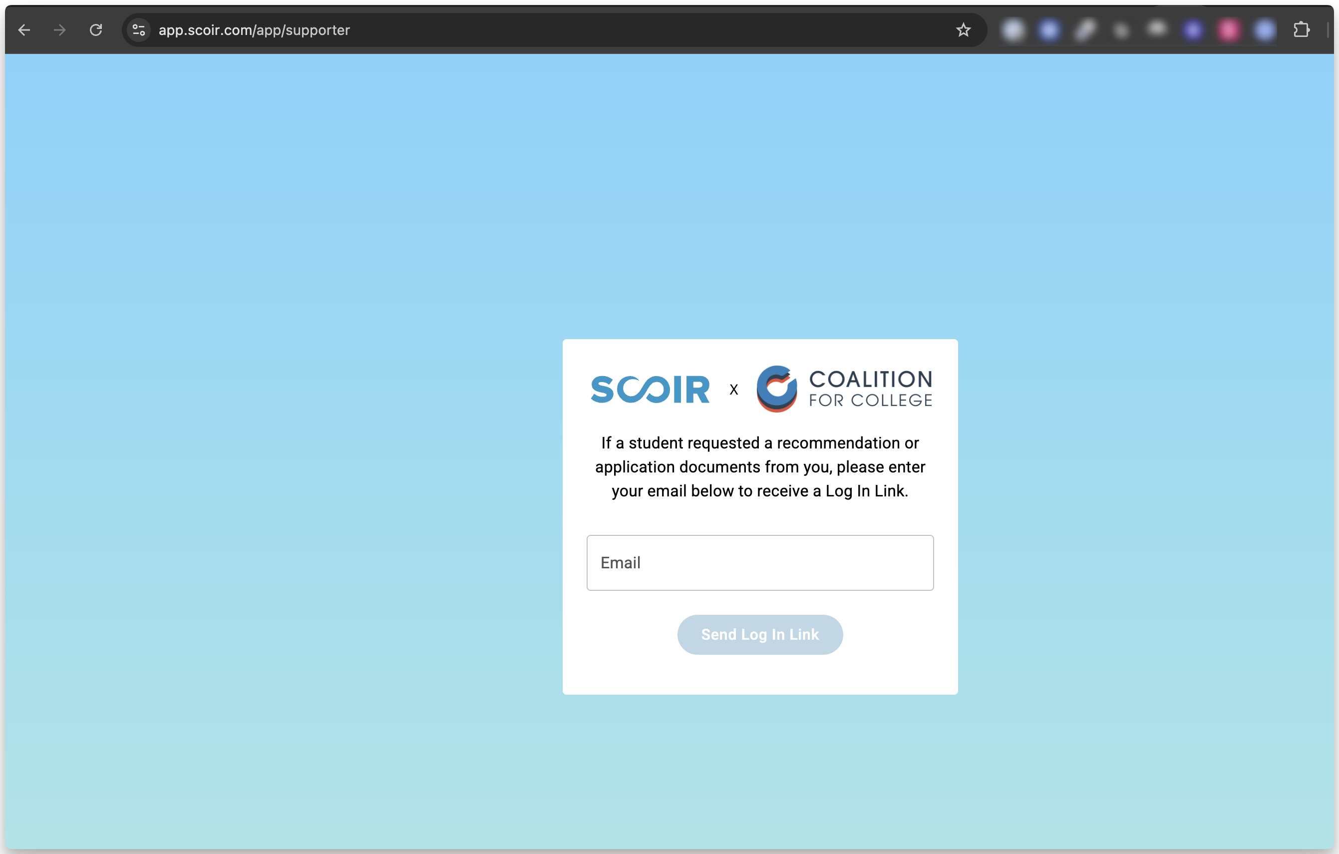 - If the steps above do not work, have your recommender request a new link directly. Once the address is confirmed as correct, share app.scoir.com/app/supporter with your recommender. They must enter the same email address you used to send the request and click Send Log In Link to receive a new email.