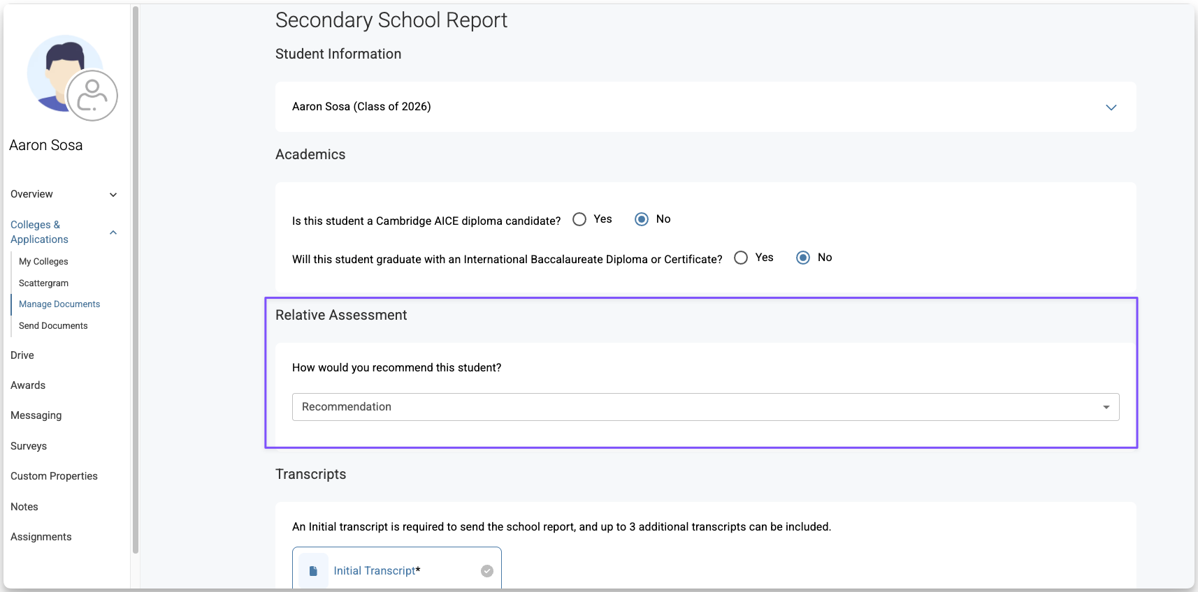 If your school uses the Common App integration, we recommend uploading the following documents before creating SSRs. You can upload these during SSR creation, but uploading them in advance helps prevent delays. These documents are attached to the School Report and sent together to colleges the student applies to through Common App: