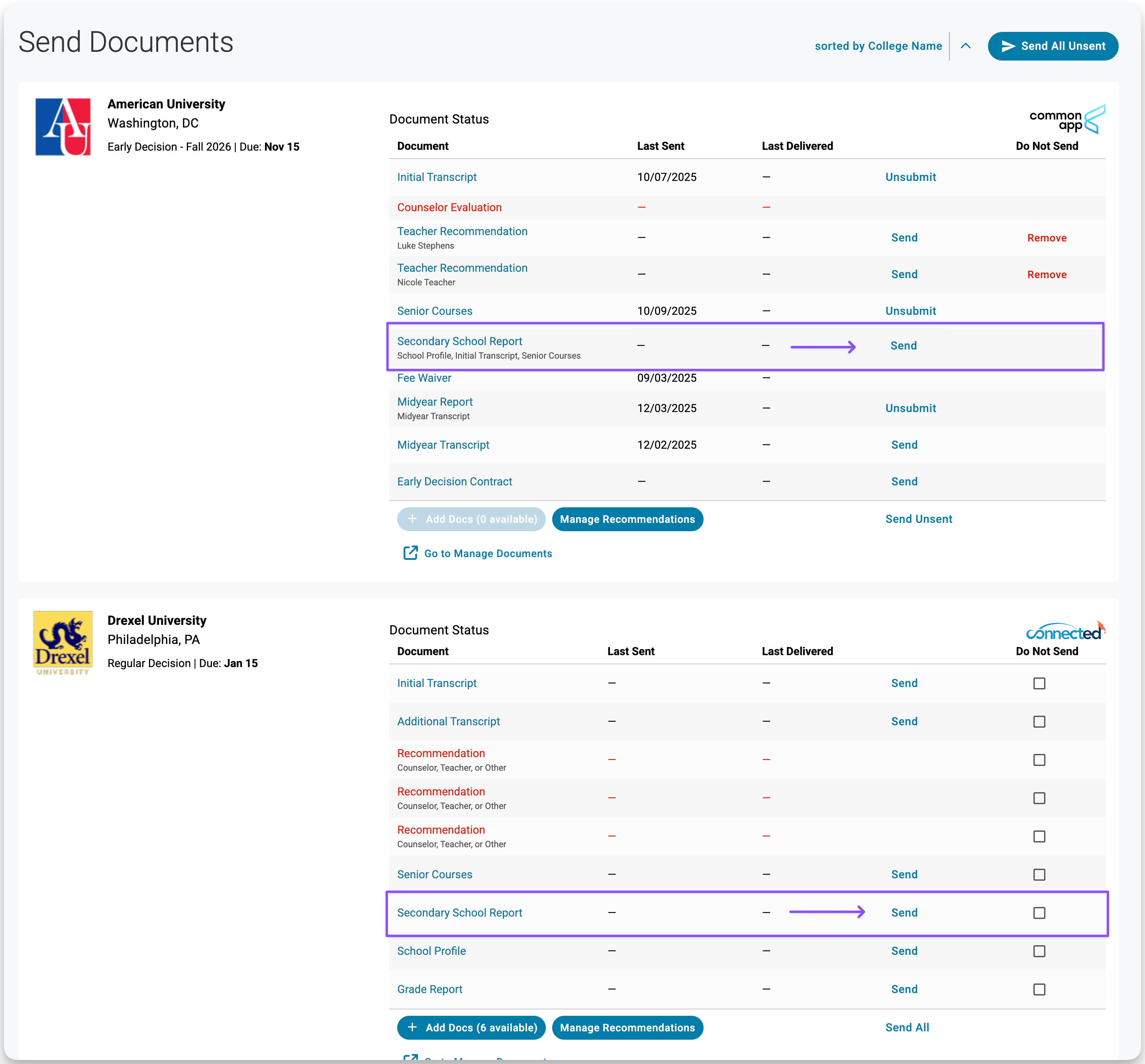 You’ll see each college the student is applying to, along with required documents.