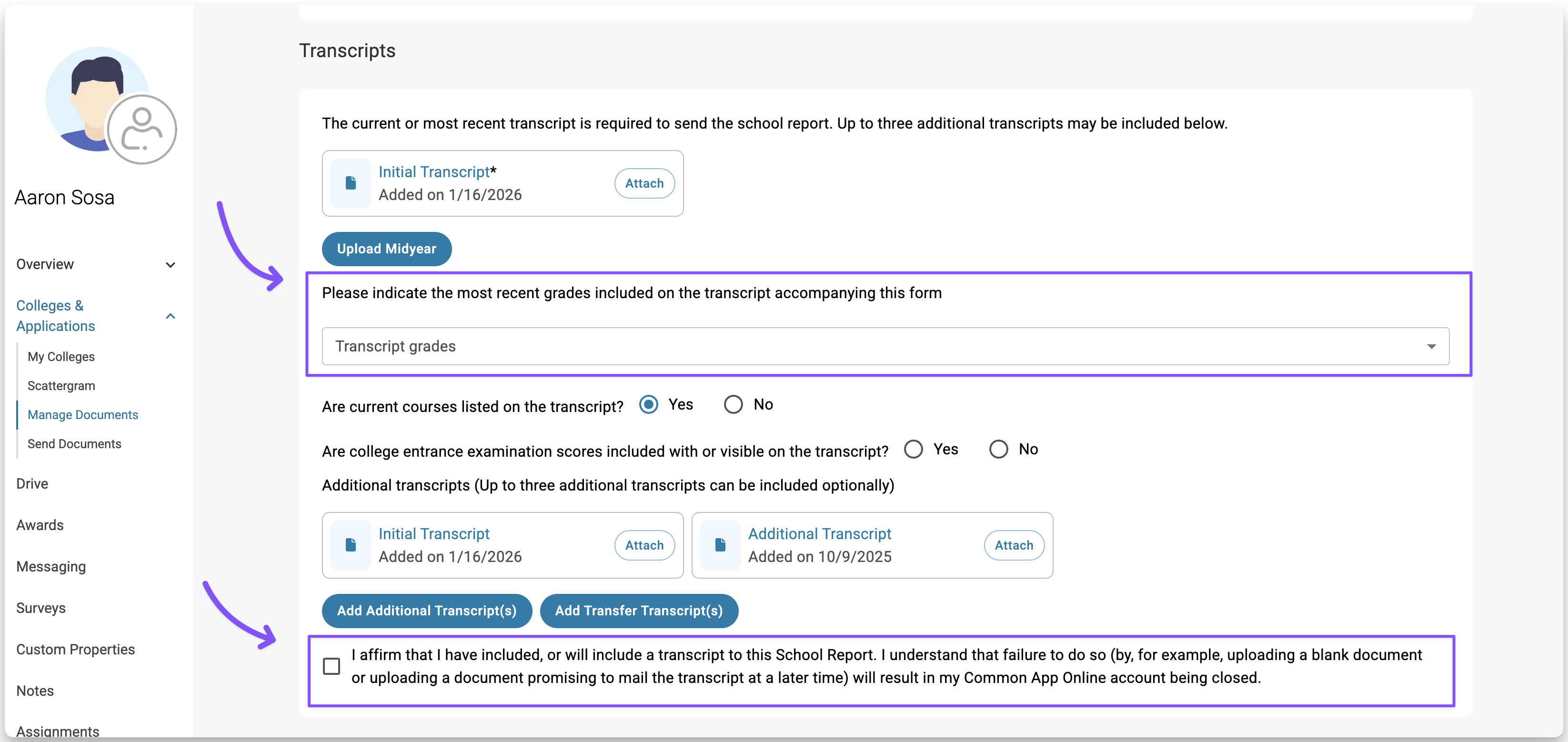 After attaching transcripts, confirm the most recent grades included and check the box to indicate that a transcript is or will be included. Missing transcripts can block Common App submissions.