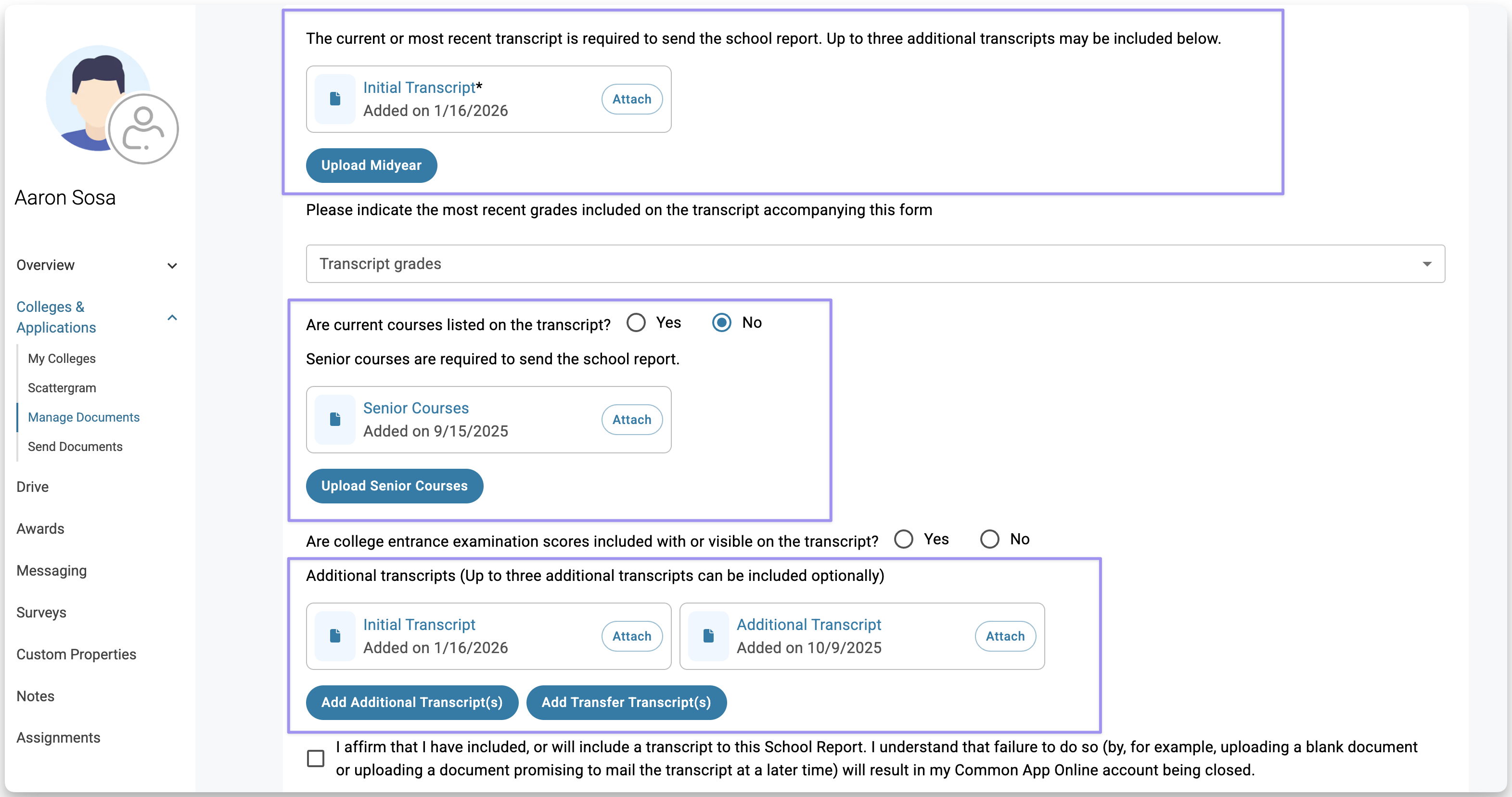 If transcripts were uploaded already, you’ll see them listed. Review them, then click Attach to include them. Replace any transcript you do not want to send before completing the School Report.