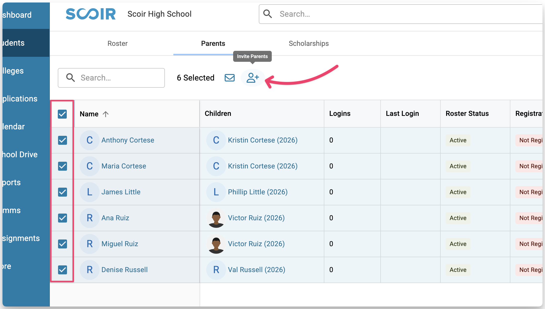 Inviting pending parents links them to your school. Parents who already have a Scoir account will be linked without receiving an email. Parents who haven’t registered yet will receive an invitation to create their account.