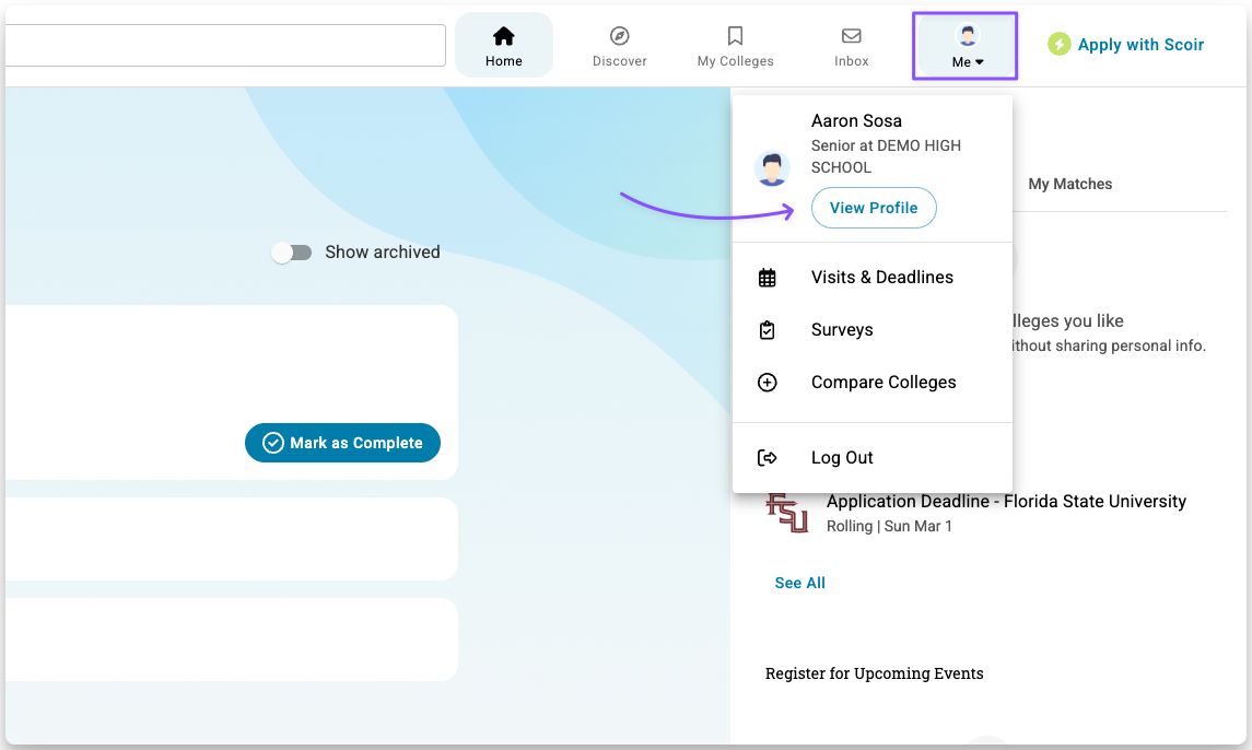 To update your personal information in Scoir, click Me in the top navigation menu, then select Profile from the dropdown menu.