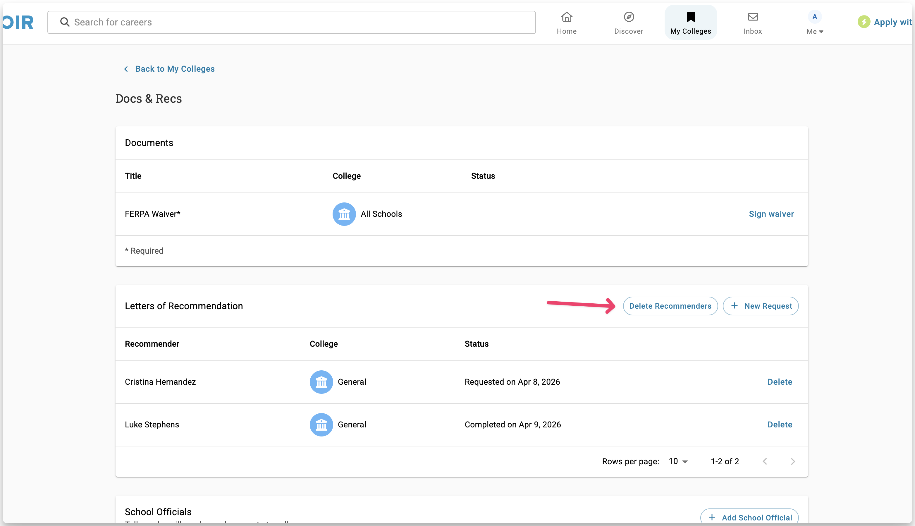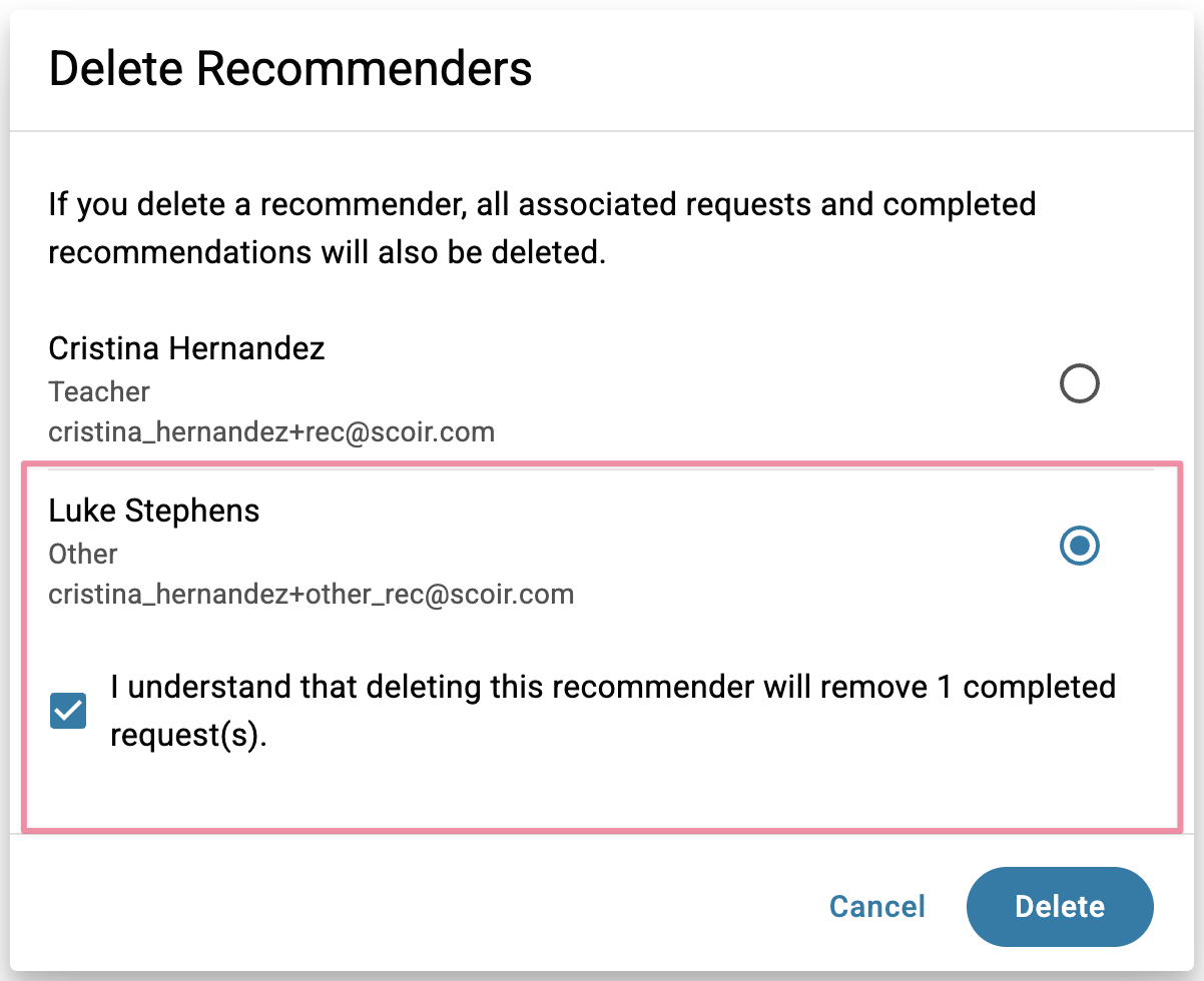 - Select the recommender with the wrong type (for example, “Other”). Confirm that you understand deleting the recommender will also delete all associated requests and any completed recommendations, then click Delete.