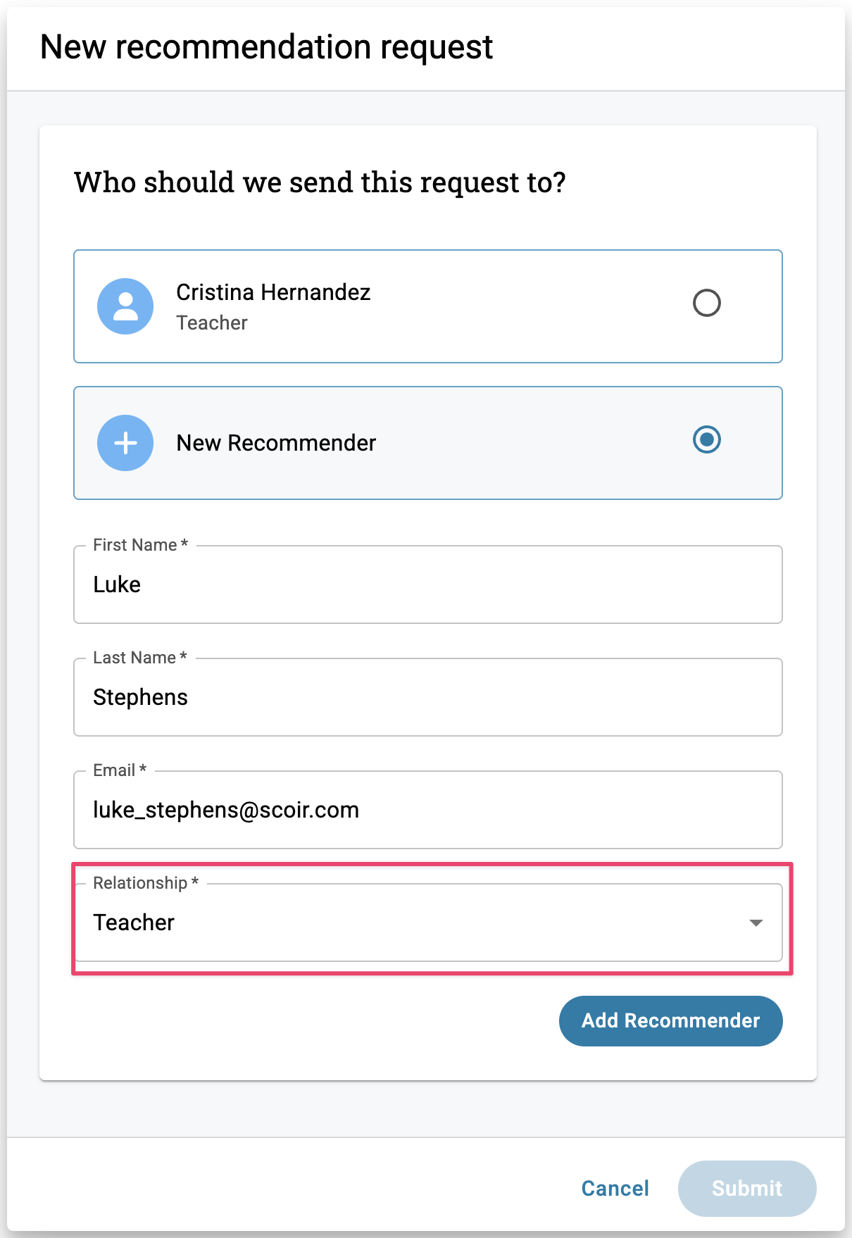 - Select New Recommender and enter their information. Be sure to select the correct relationship type (for example, "Teacher"). Then, select Add recommender.