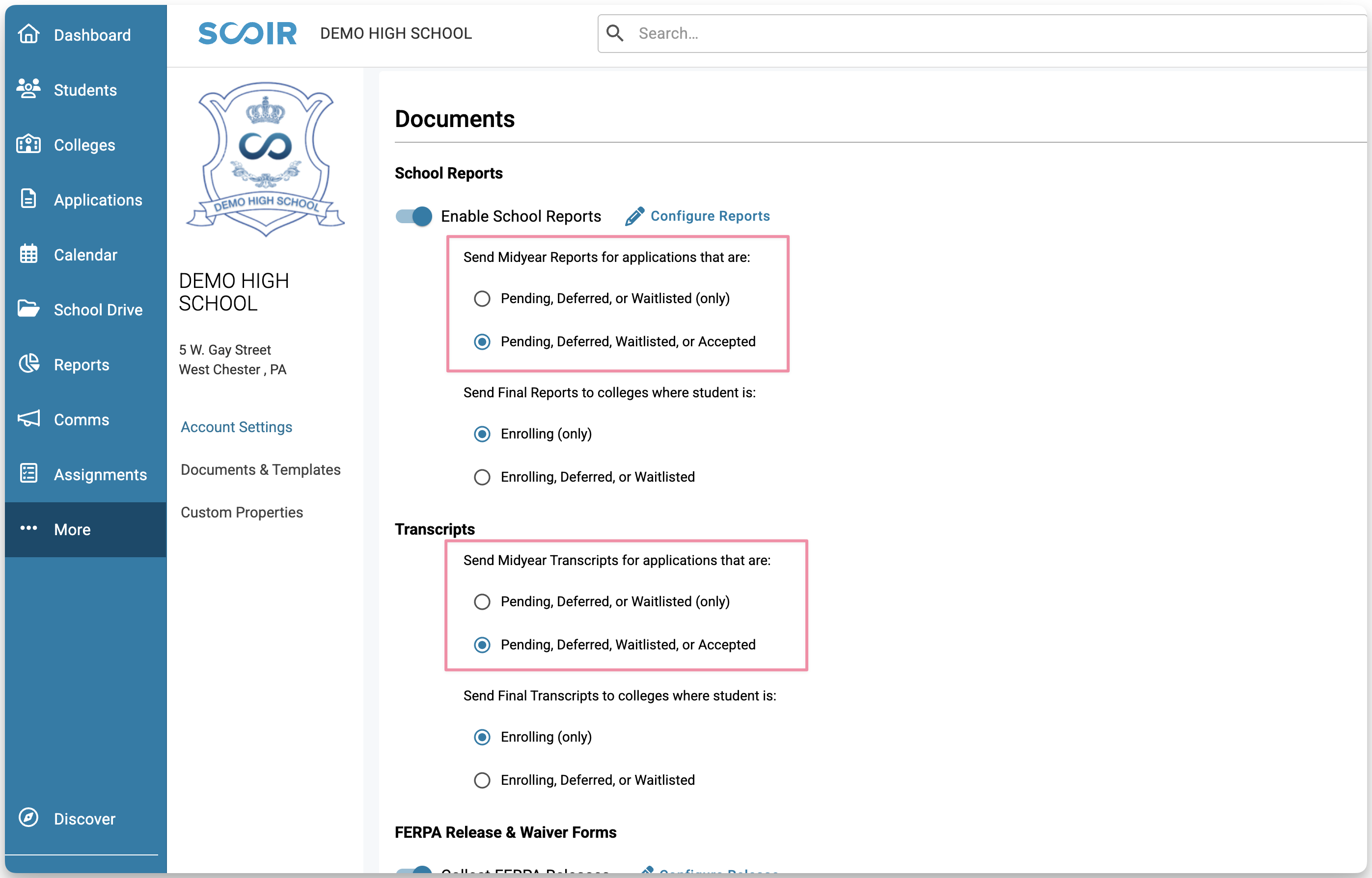 - All Other Application Methods: Your school settings control which college packets Scoir automatically pulls midyear documents into. For the outcomes selected, Scoir automatically pulls completed midyear documents into Send Documents for colleges the student has marked as Applied with those outcomes.