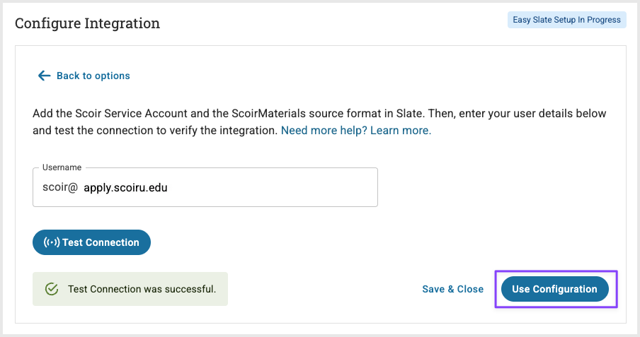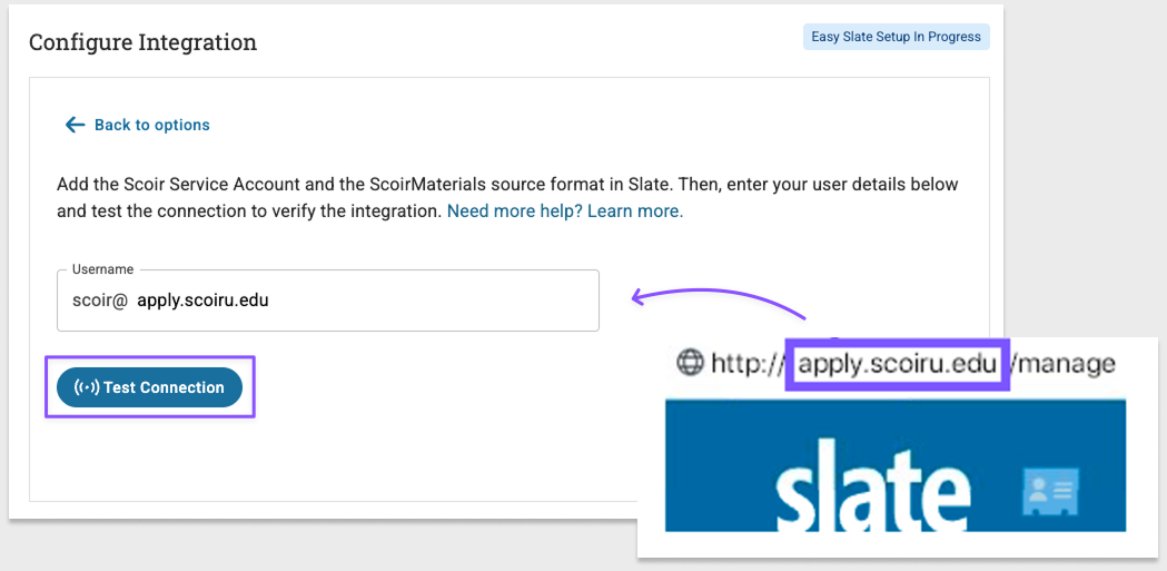 - Enter your Slate Username in the designated field and click Test Connection. Your Slate Username is the domain name associated with your Slate system. You can locate this in the address bar of your web browser when accessing Slate.