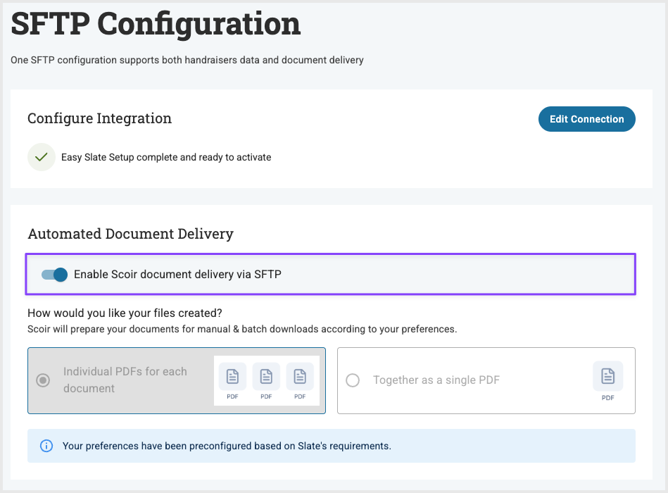 - Once you’ve successfully set up a connection and selected a configuration, you can begin using your SFTP connection to automate document delivery by setting the Enable Scoir document delivery via SFTP toggle to Active. Your document delivery preferences will be preconfigured based on Slate’s requirements.