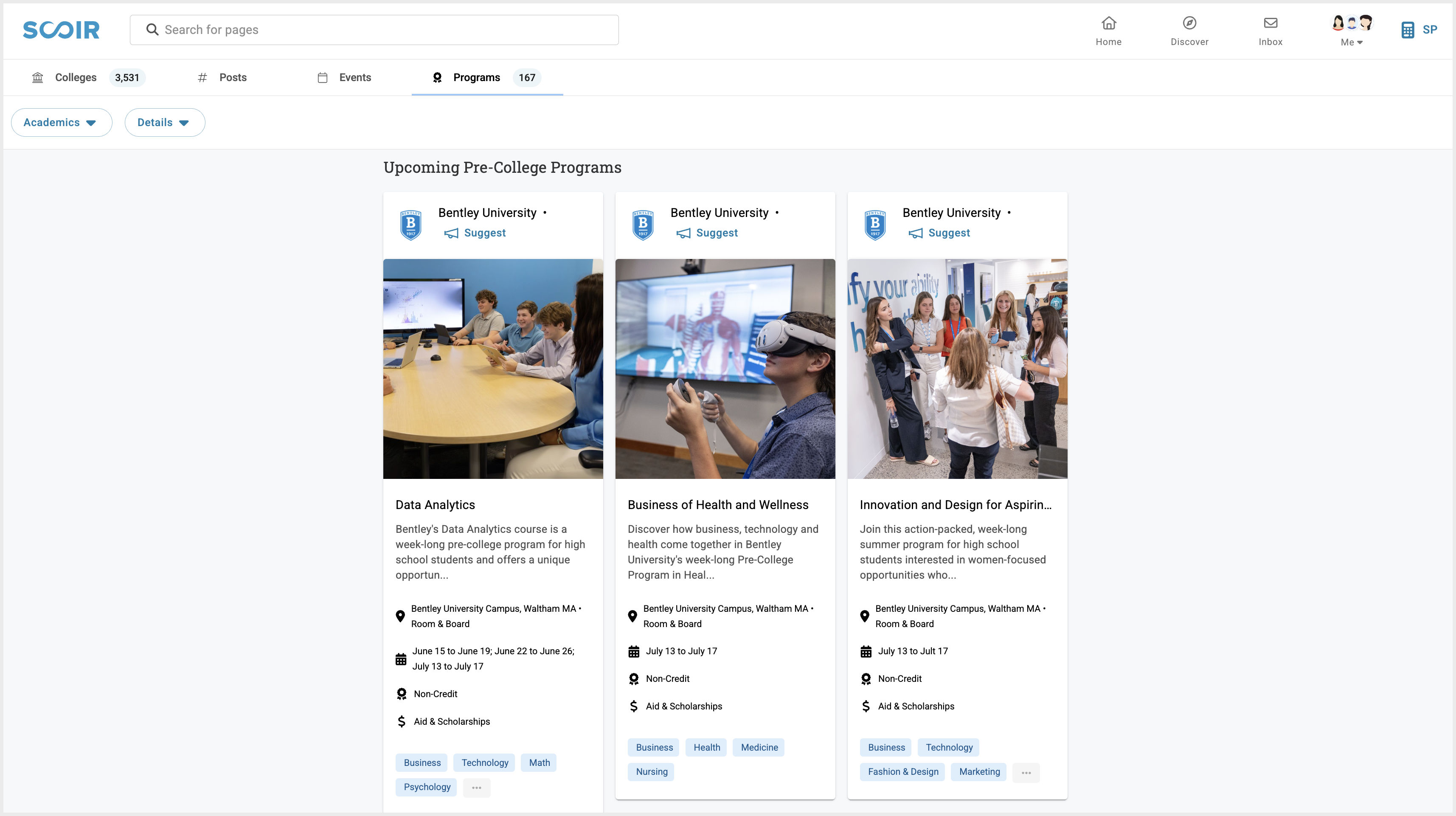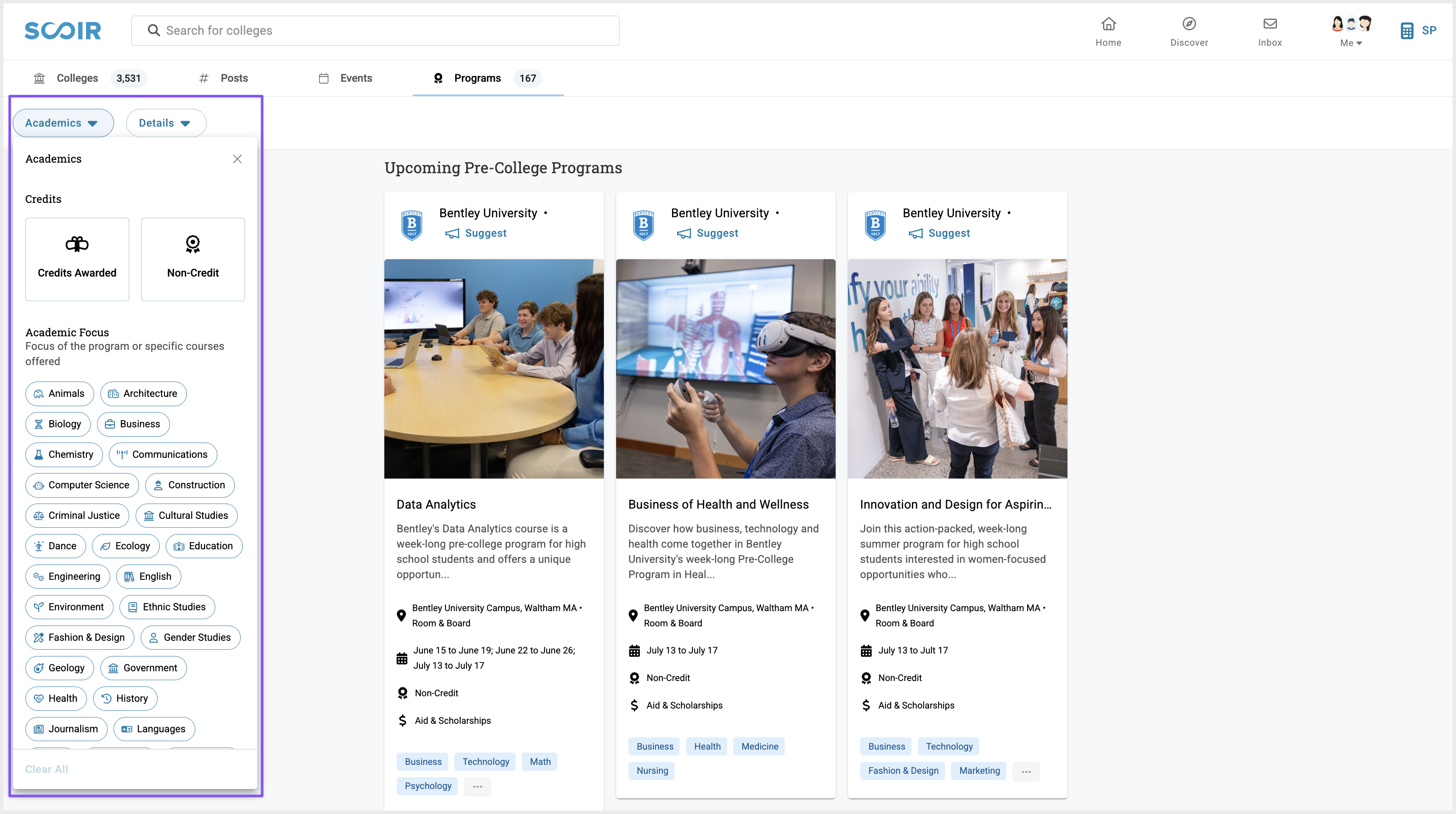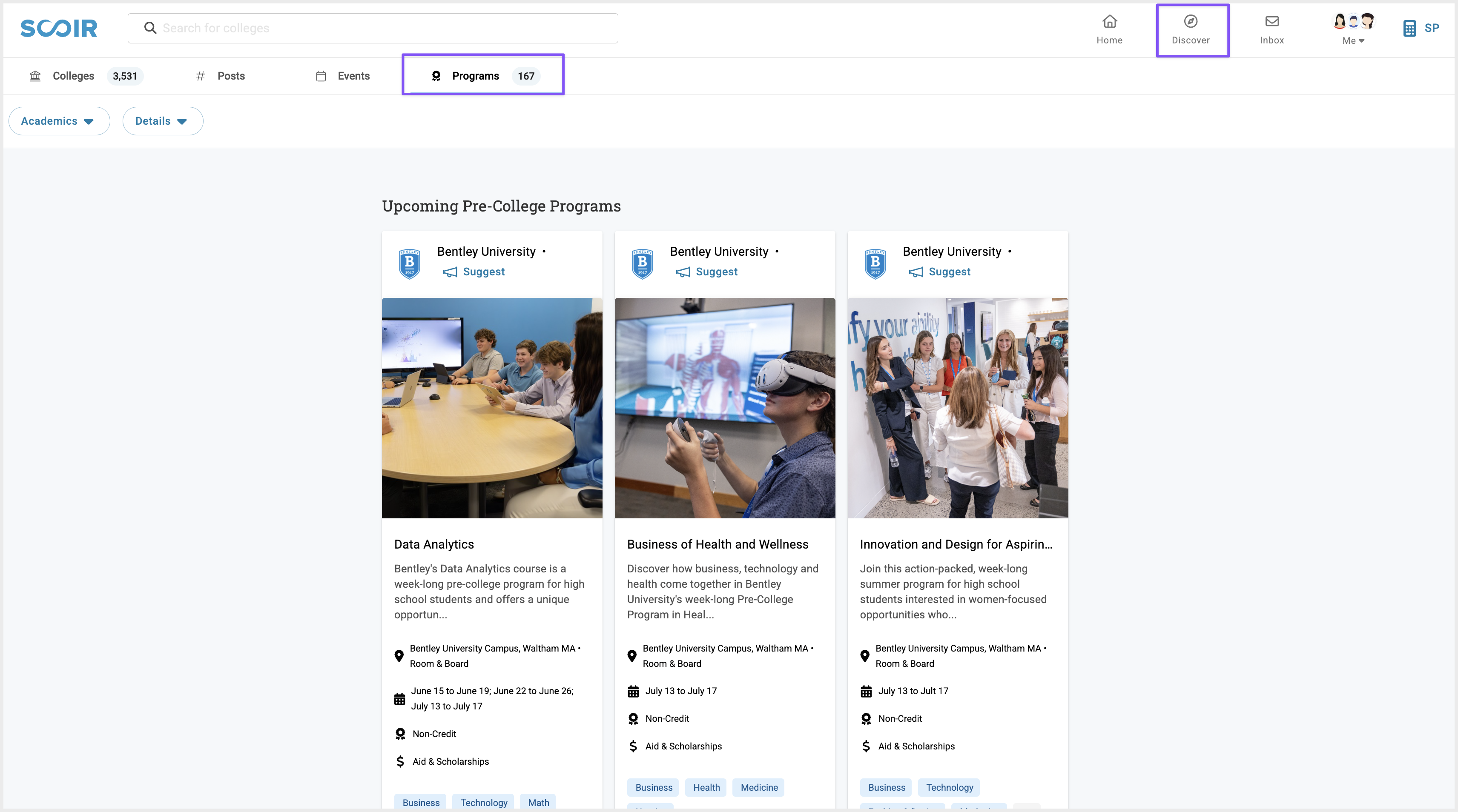 Scroll to view Programs offered by the colleges you and your student are interested in. On each card, you can see the dates of the Program, where it’s located, credits awarded, and other important details.