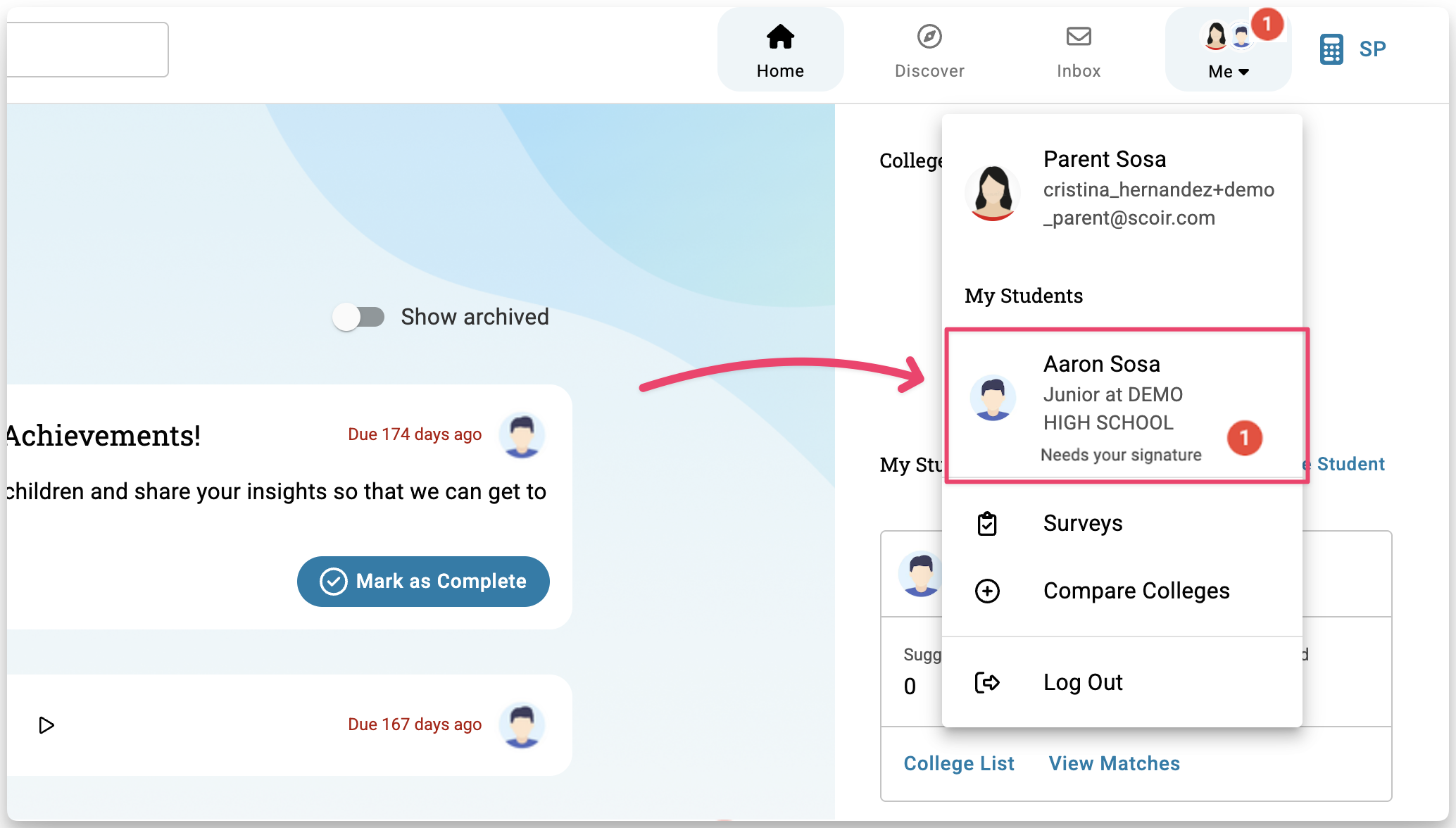 - Next to your student’s name, look for a notification that says your student “Needs your signature.” If you see it, click your student's name to go straight to their profile.