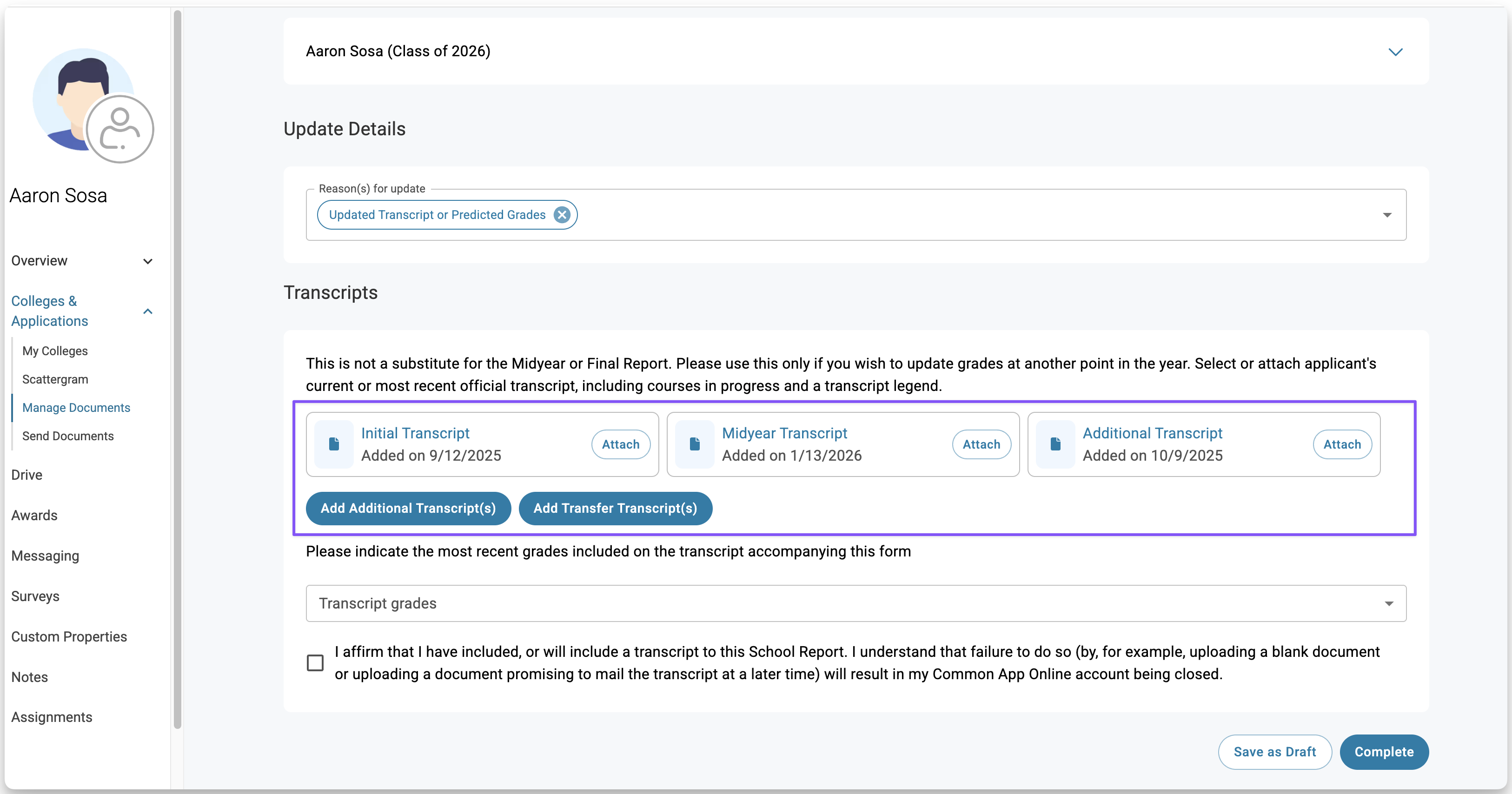 - If you need to include a transcript (Initial, Midyear, Additional, or Transfer) or another supporting document, you can upload a new file or attach one that was uploaded earlier.