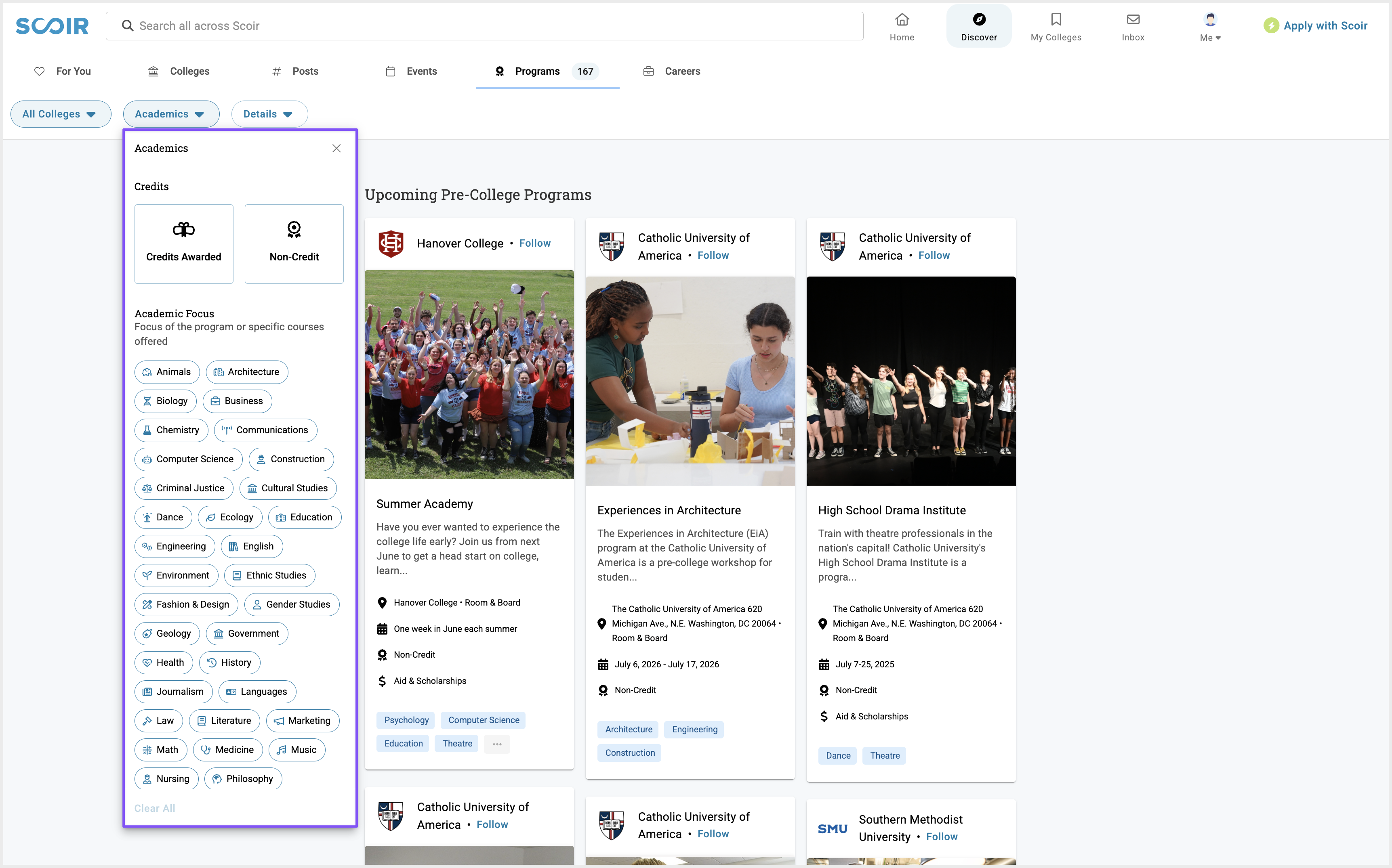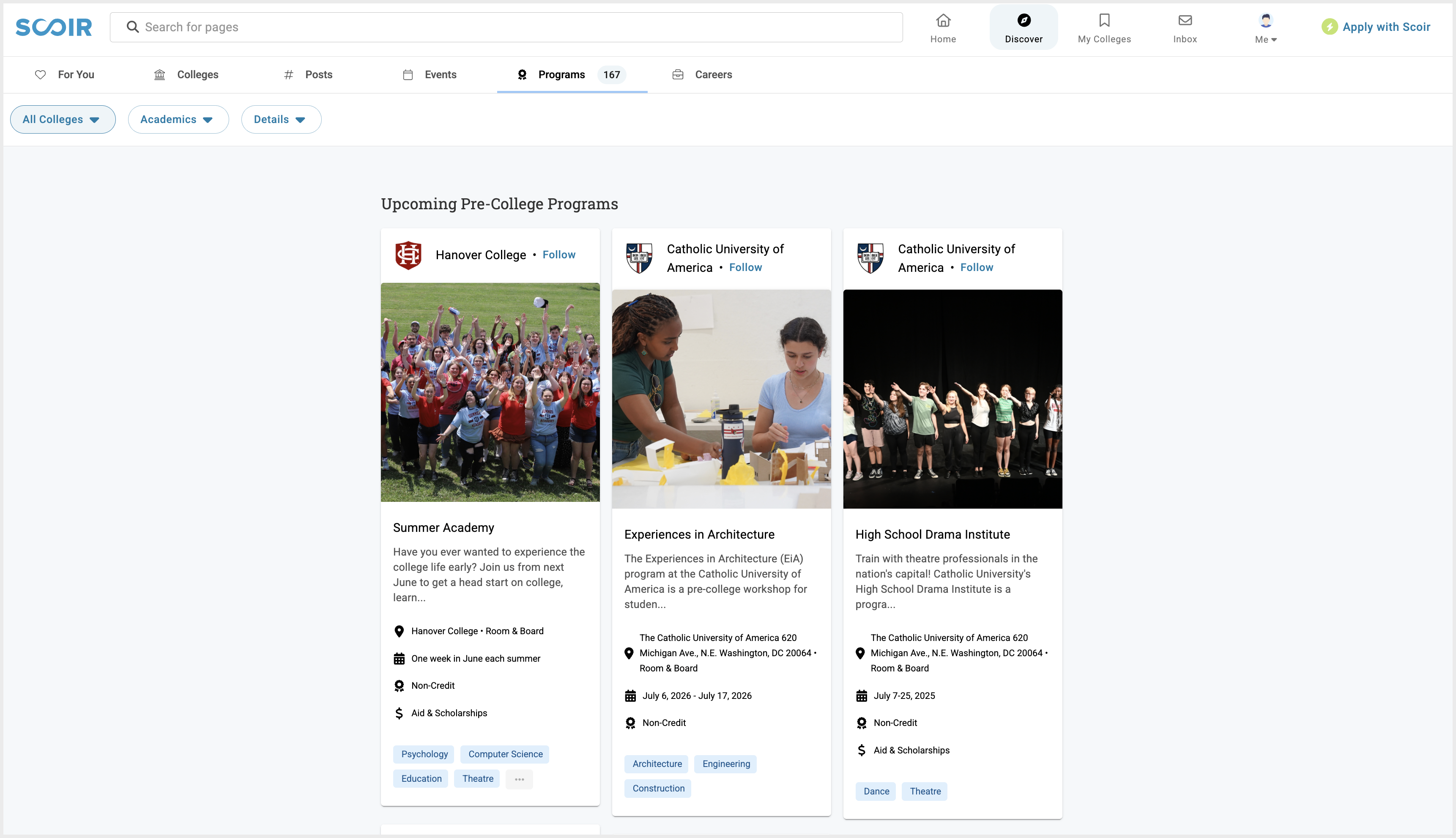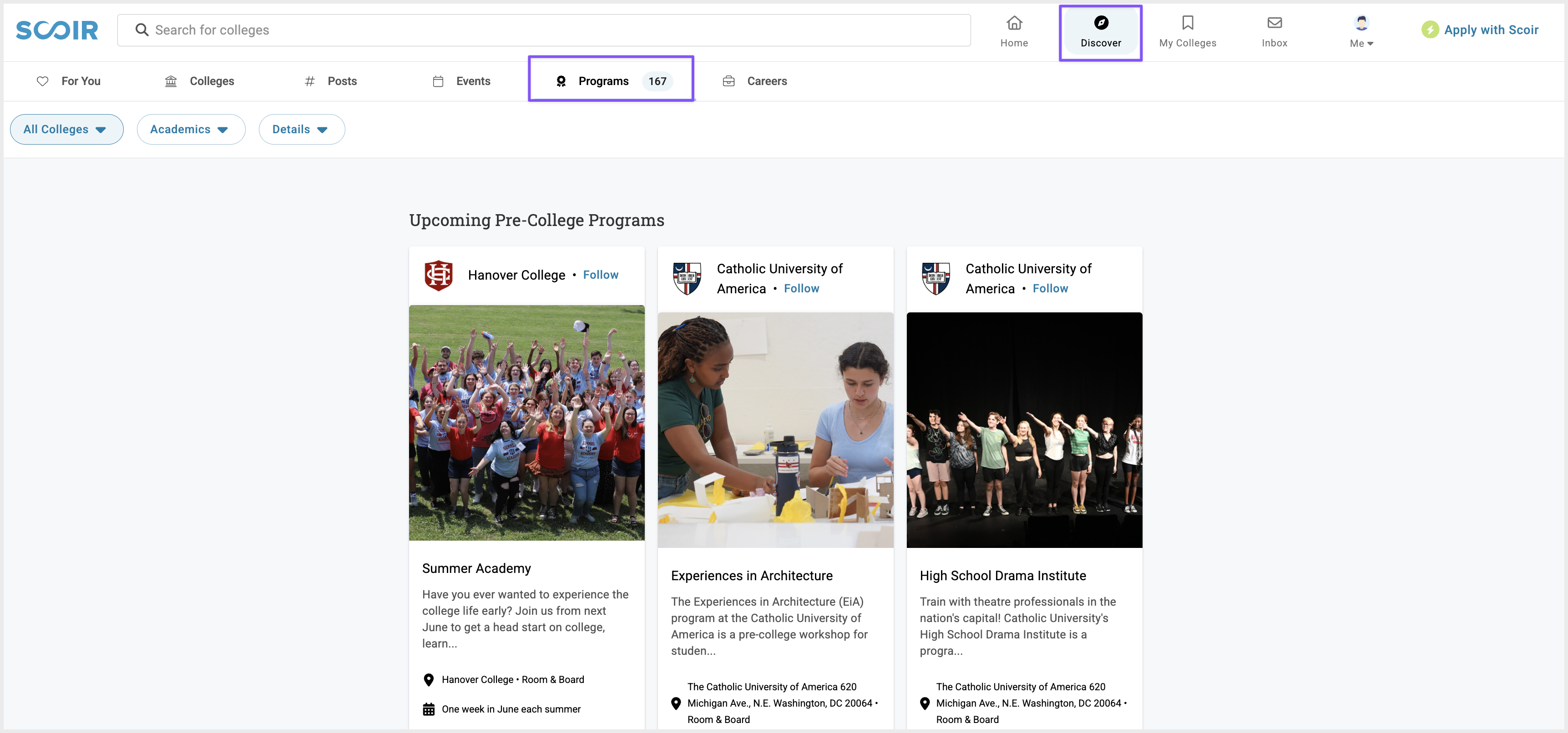 Programs are a great way for you to learn more about the colleges you’re interested in. Let’s look at how you can easily discover and register Pre-College Programs in Scoir.