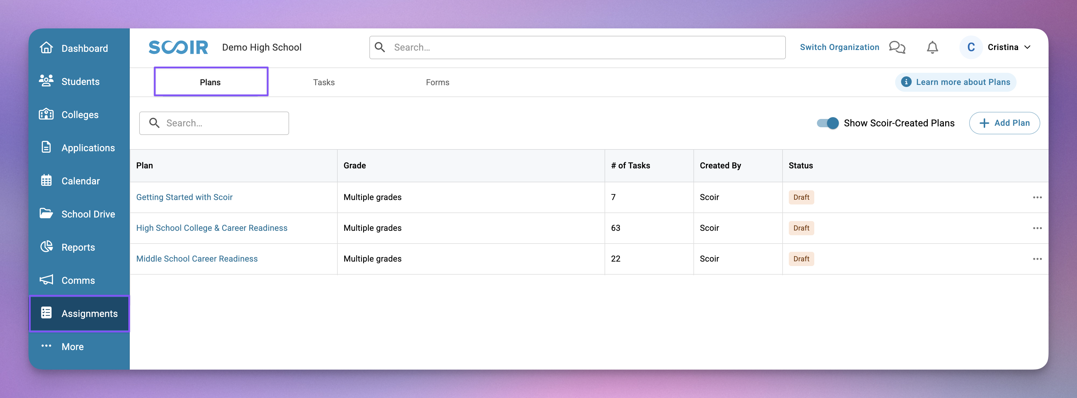 You'll find Scoir-Created Plans in Assignments > Plans. Depending on your school's setup, you'll see either the High School College & Career Readiness Plan or the Middle School Career Readiness Plan, or both, along with our Getting Started with Scoir plan, which everyone receives.