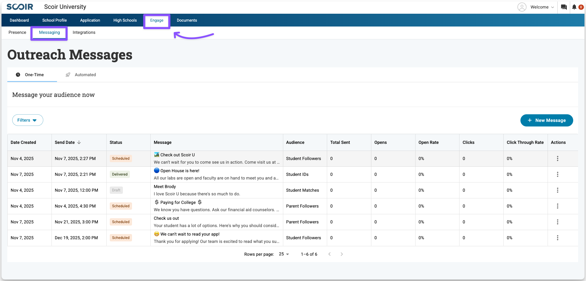 - From your Scoir account, go to Engage > Messaging. This is where you’ll create, schedule, and manage all of your Outreach Messages.