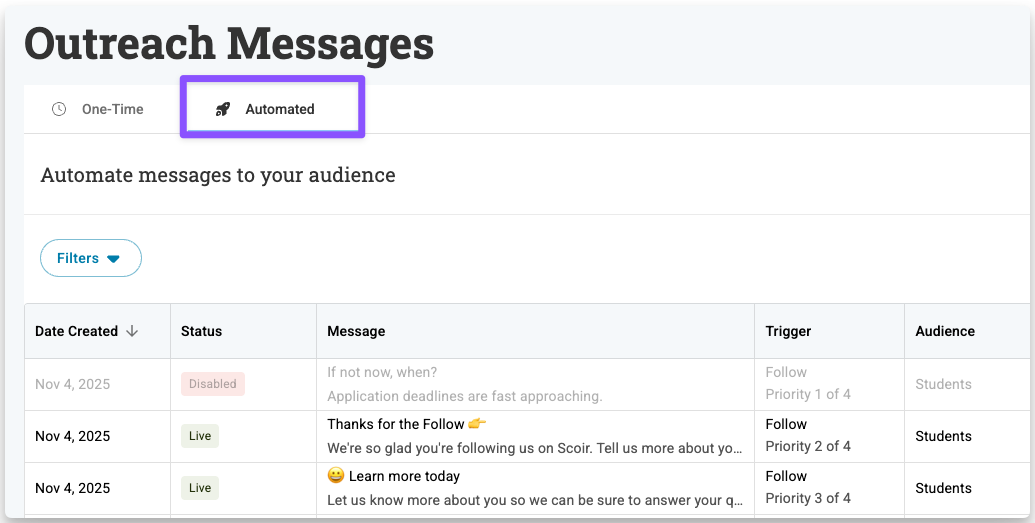 Automated Outreach Messages send automatically to students or parents when students take specific actions in Scoir—such as following your college, indicating they’re applying, or marking themselves as applied. After setup, Scoir sends each message within two hours of the trigger, and you can monitor performance metrics in the Messaging page.