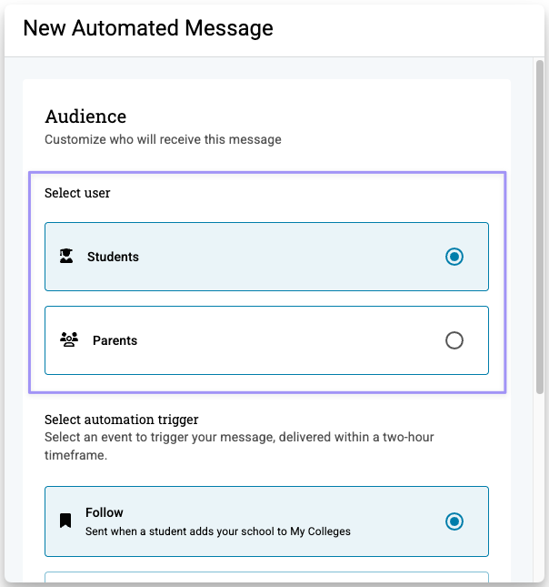 Students or parents can only receive one Automated Message per trigger type (Following, Applying, or Applied). If a student or parents meets the criteria for multiple messages, you can set a priority to decide which one they receive.