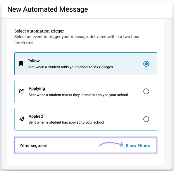 Engagement Stage lets you choose whether you want to reach students who are Following your college, are Applying, or have Applied