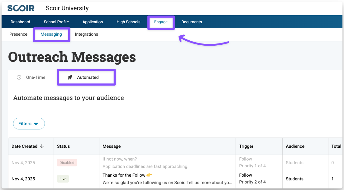 - From your Scoir account, go to Engage > Messaging. Then, select the Automated tab.