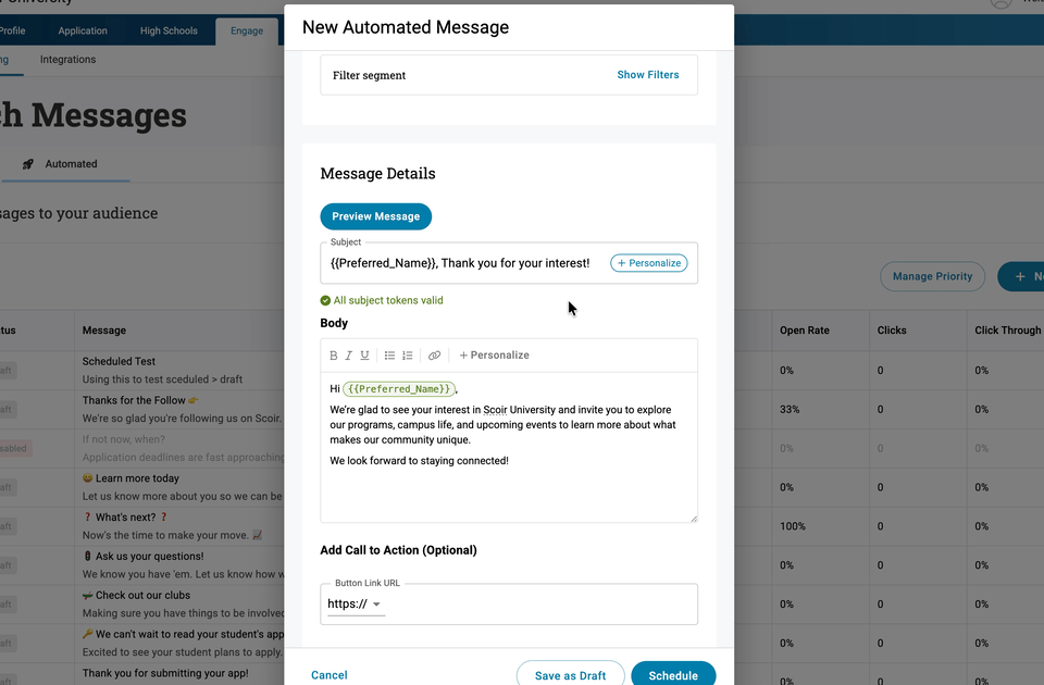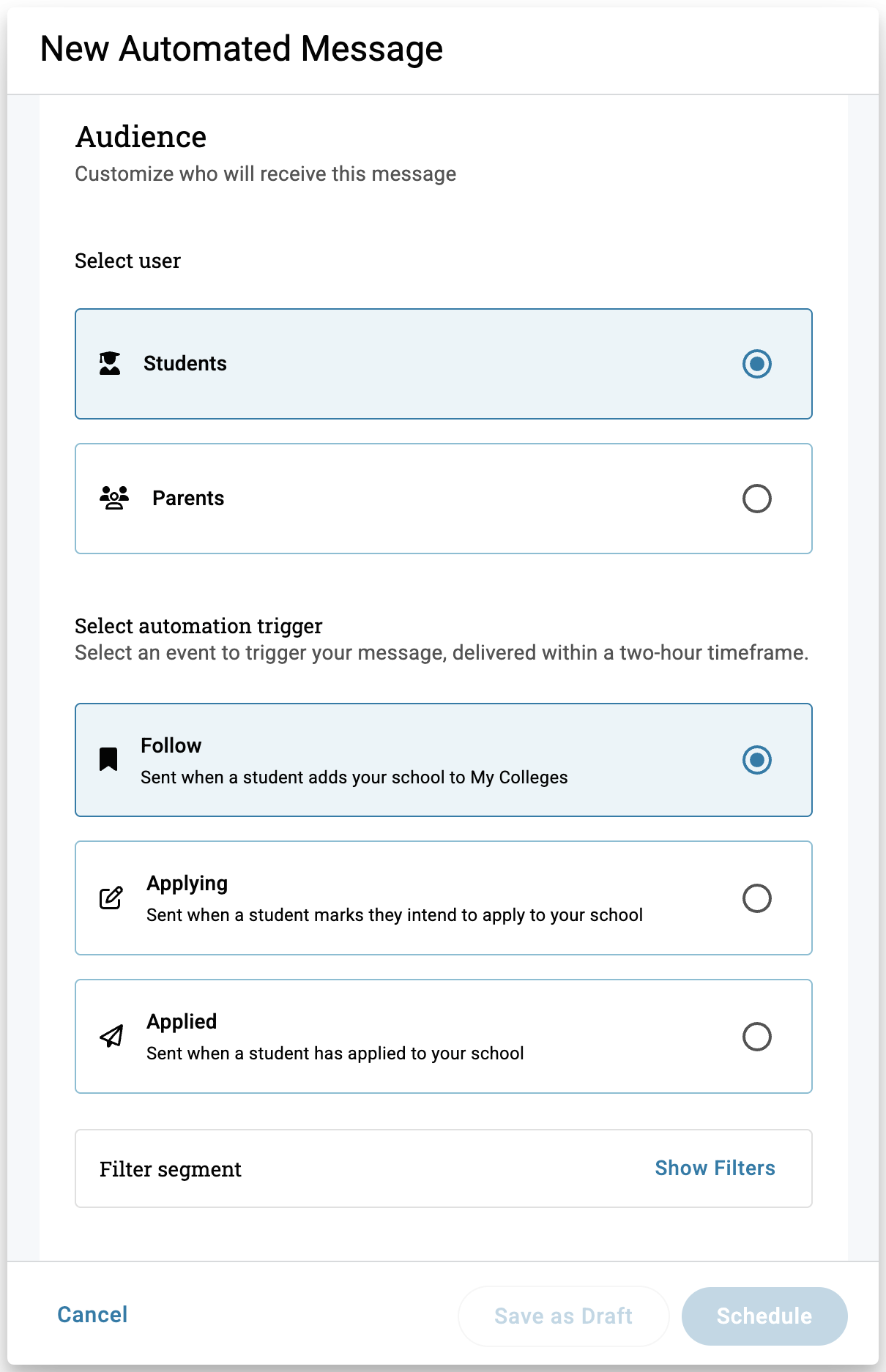 Automated Messages send automatically when a student or parent (available on Growth and Enterprise plans) takes a specific action in Scoir, like following your college or marking themselves as applying or applied.