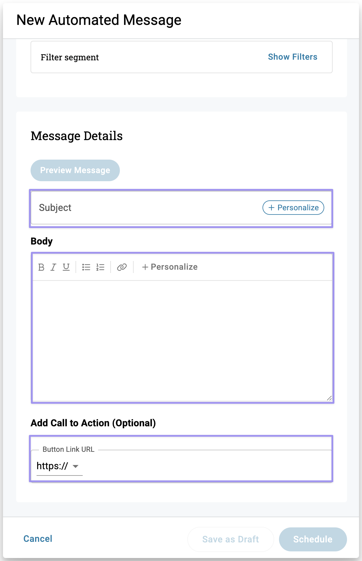 At the top of the page, select the Automated tab and click + New Message to open the message creation window