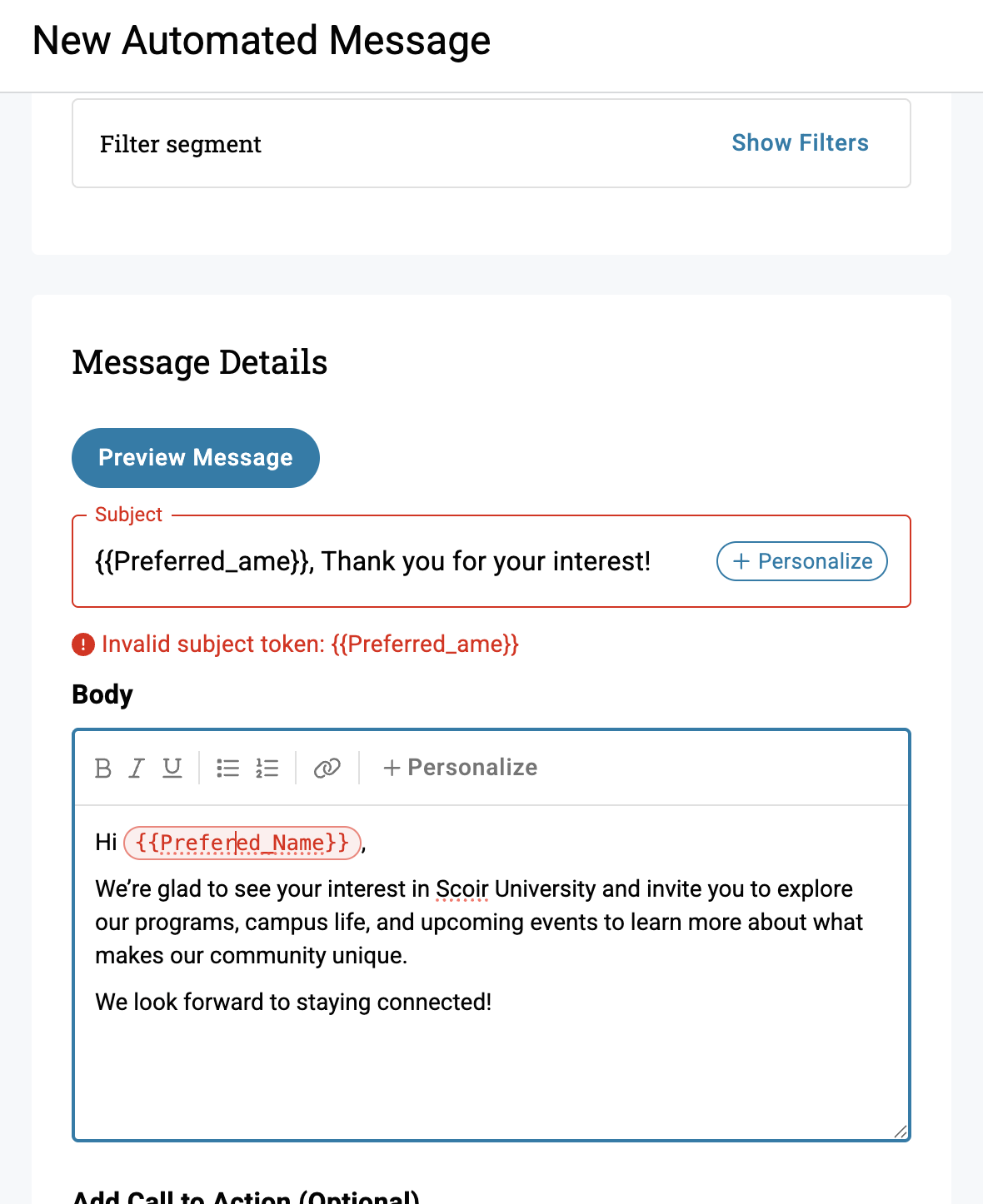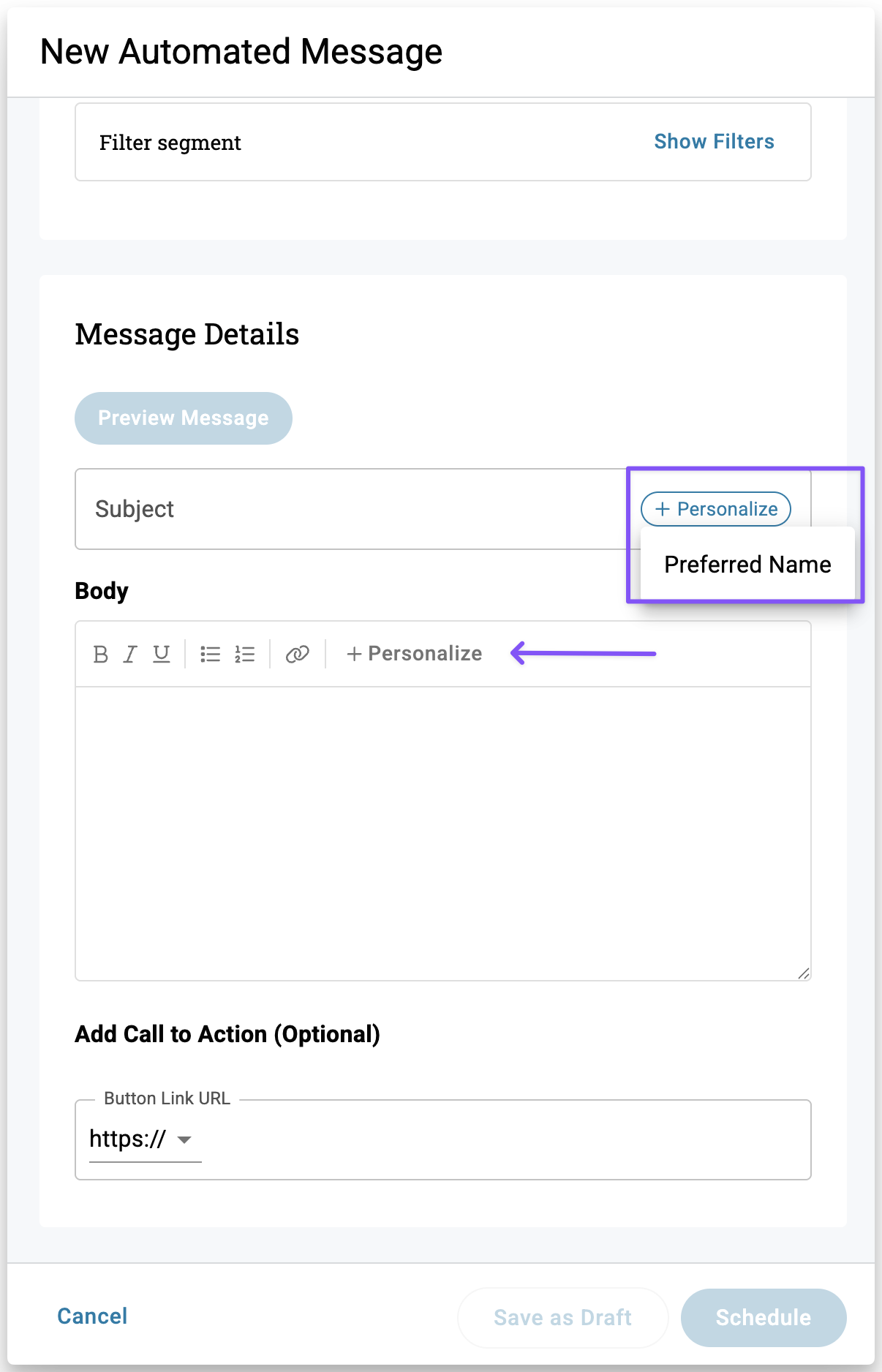 To add a token, click + Personalize in the subject line or the body toolbar and choose Preferred Name.