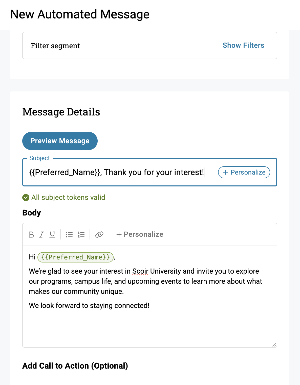 - In the subject, you will see a green “All subject tokens valid” confirmation below the field. If a token is invalid, an error message will appear