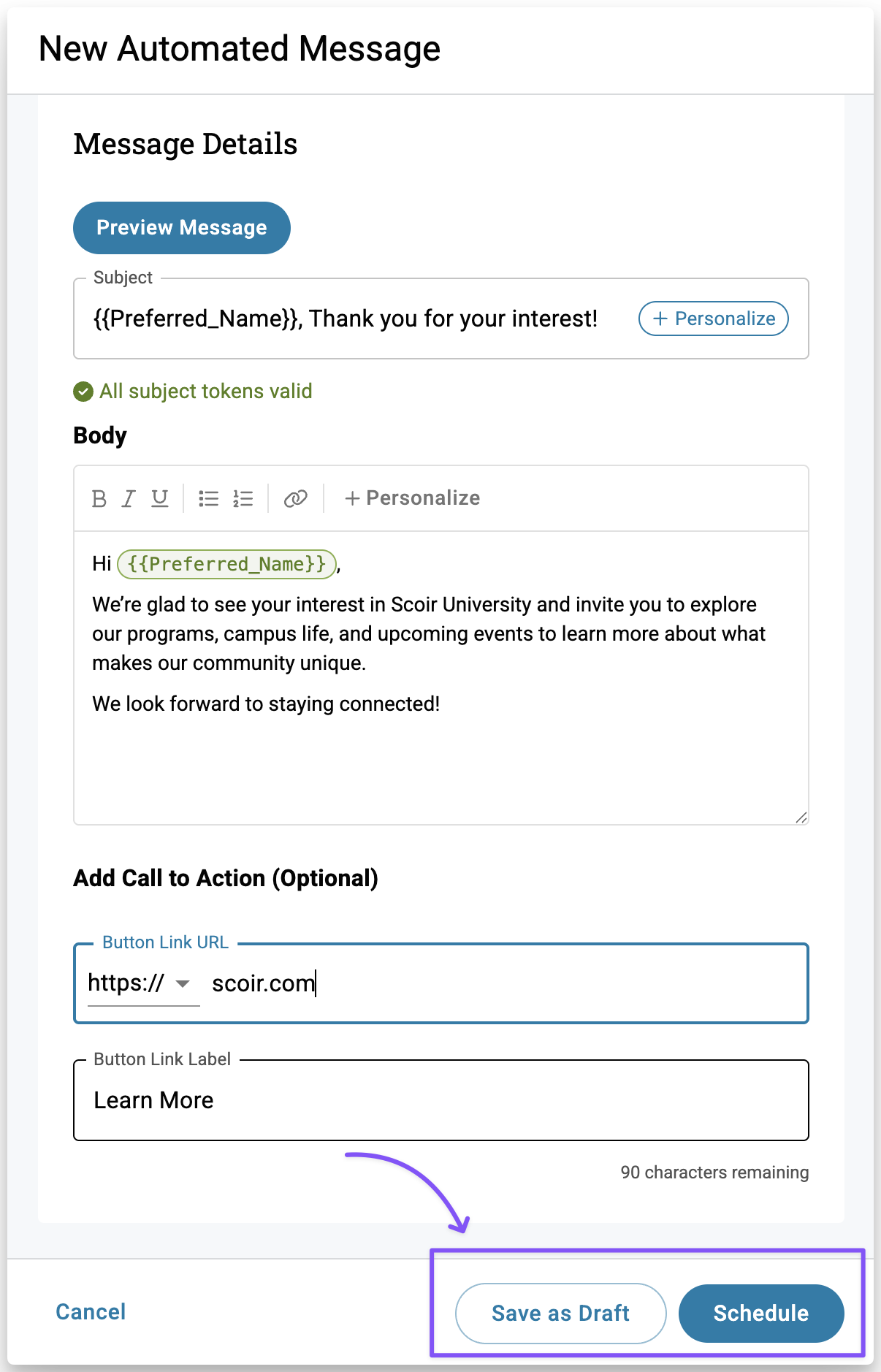 When you are ready, click Schedule to activate your message. Click Save as Draft to come back to it later.
