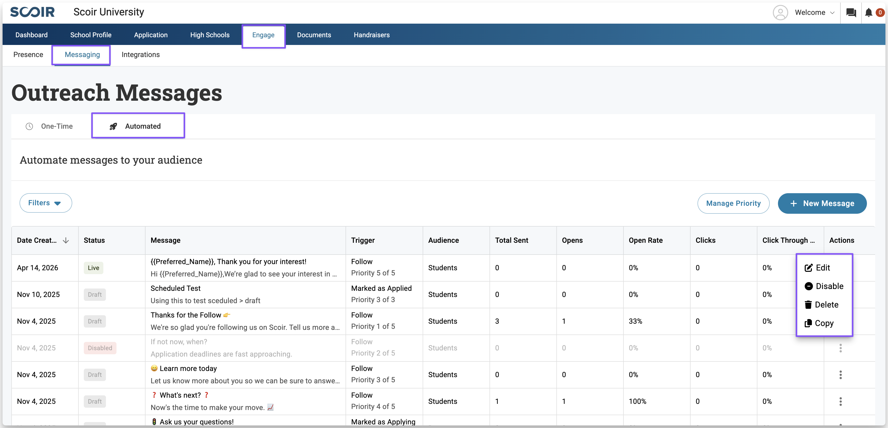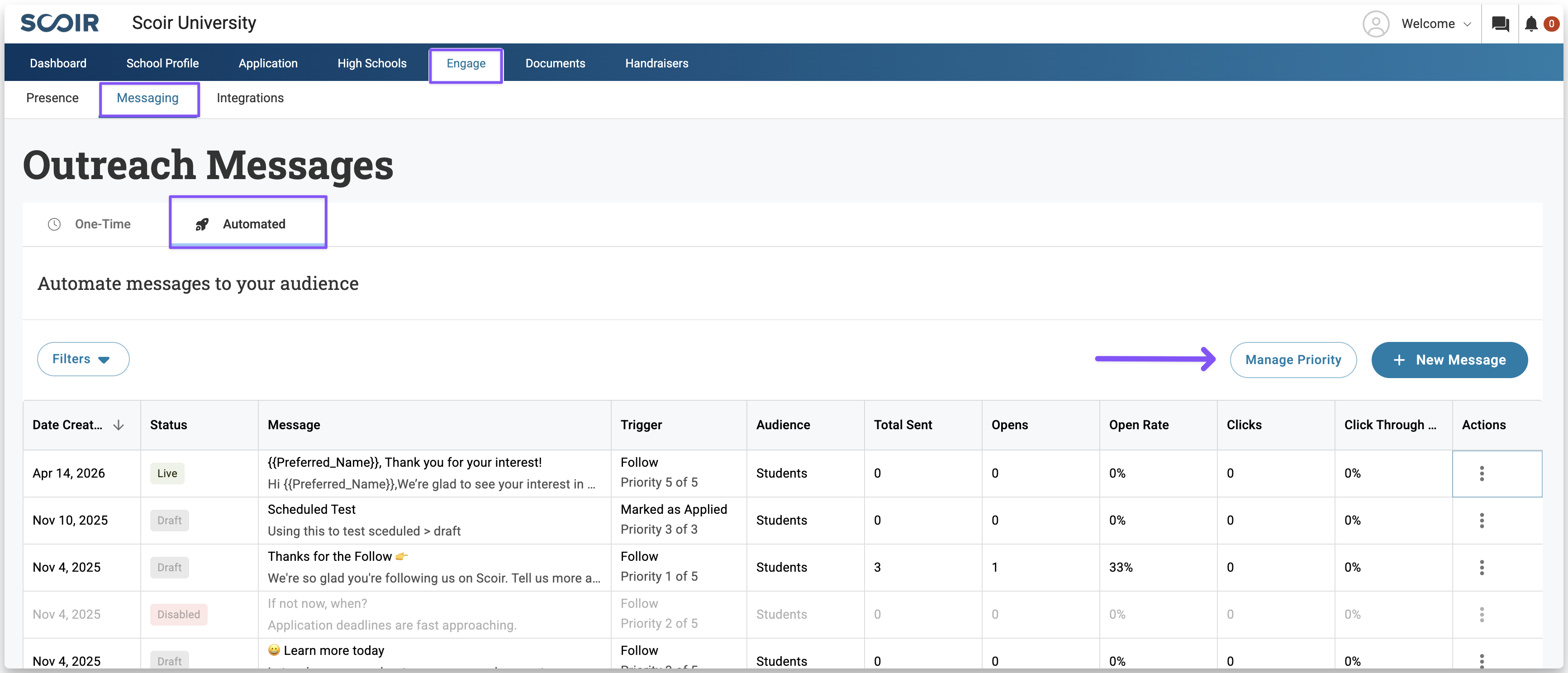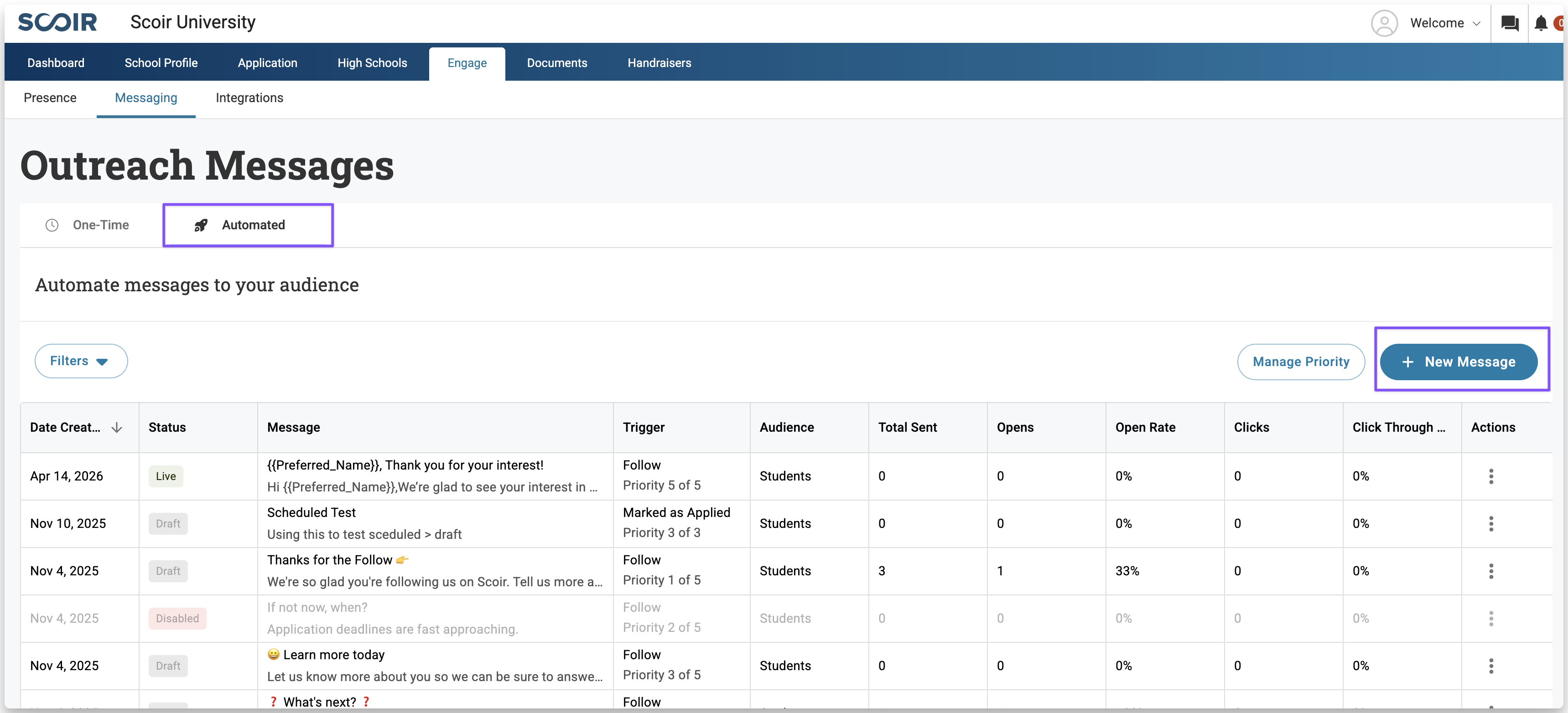 From your Scoir account, go to Engage > Messaging. This is where you’ll create, schedule, and manage all of your Outreach Messages.
