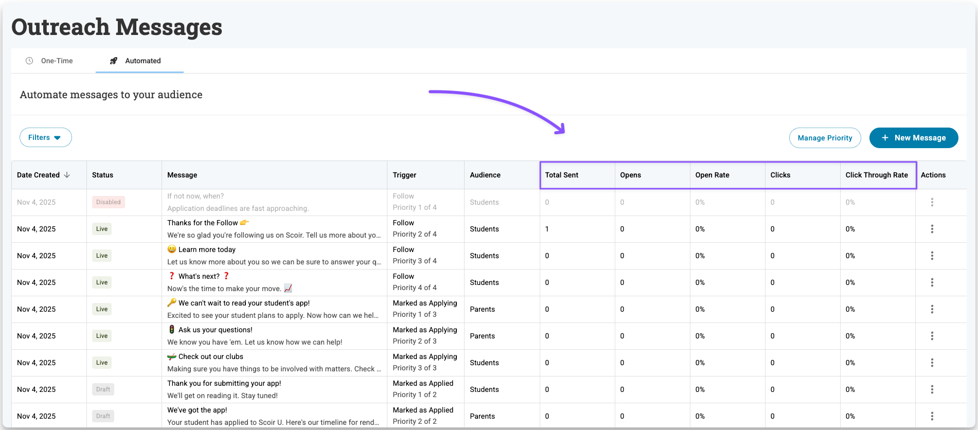 Once messages are sent, performance metrics appear in the table and update as recipients engage. Messages are sorted by Send Date by default, with the most recent at the top. Click any column header to re-sort.